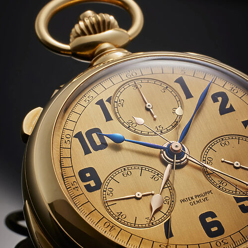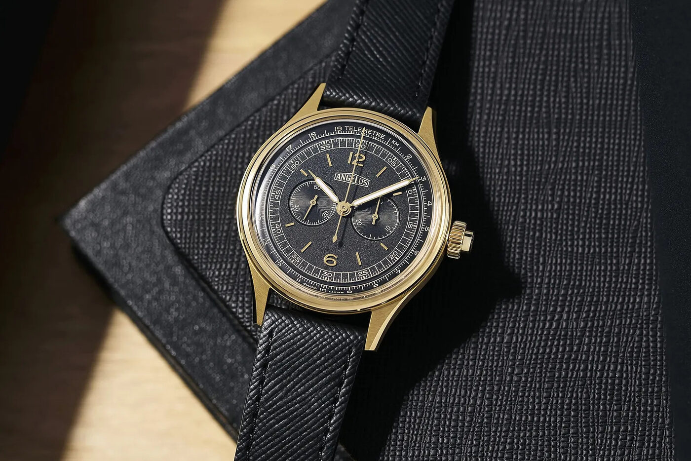 이 시계는 18K 옐로우 골드 케이스에, 1930~40년대 빈티지 모델의 스텝 베젤을 복각했으며, 두께는 단 9.25mm로 매우 얇다. 크라운에 통합된 모노푸셔 크로노그래프 기능이 특징이며, 그레인 처리된 블랙 다이얼에는 30분 카운터와 러닝 세컨즈의 듀얼 레지스터 구성이 있다. 동력은 수동식 Angelus Cal. A5000 무브먼트로 제공되며, 아름답게 장식되어 있다.