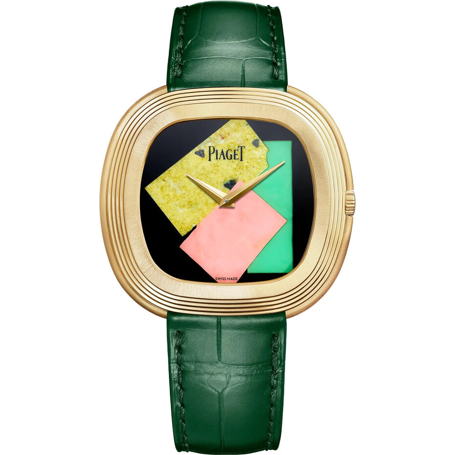 이 시계는 18K 옐로우 골드 케이스를 사용해 원작 15102와 동일한 크기를 유지했다. 다이얼은 워홀의 폴라로이드 자화상을 바탕으로, 다양한 보석을 상감 세공하여 완성했다. 이번 협업의 첫 해에 색채를 핵심 테마로 설정한 피아제는 폴라로이드 이미지를 워홀 특유의 추상적인 스타일로 재해석해 네 가지 보석으로 표현했다. 검은색 오닉스, 노란색 나마비아 서펜틴, 분홍색 오팔, 그리고 녹색 크리소프레이즈. 다이얼 제작 과정을 보고 있자면, 그 영감이 어디서 왔는지 명확히 알 수 있다.