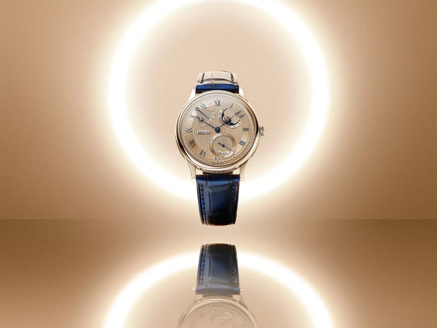 케이스 두께는 9.9mm로 매우 얇으며, 인하우스 오토매틱 무브먼트 ‘Breguet Cal. 502.3 DR1’이 탑재되어 있다. 이 무브먼트는 비대칭 오실레이팅 웨이트를 사용하며, 전체 높이는 단 3.95mm에 불과하다. 다이얼은 브레게의 상징적인 수공 기요셰 패턴을 모티프로 정교하게 장식되어 있다. 250년의 워치메이킹 역사를 기념하기에 완벽한 작품이라 할 만하다.