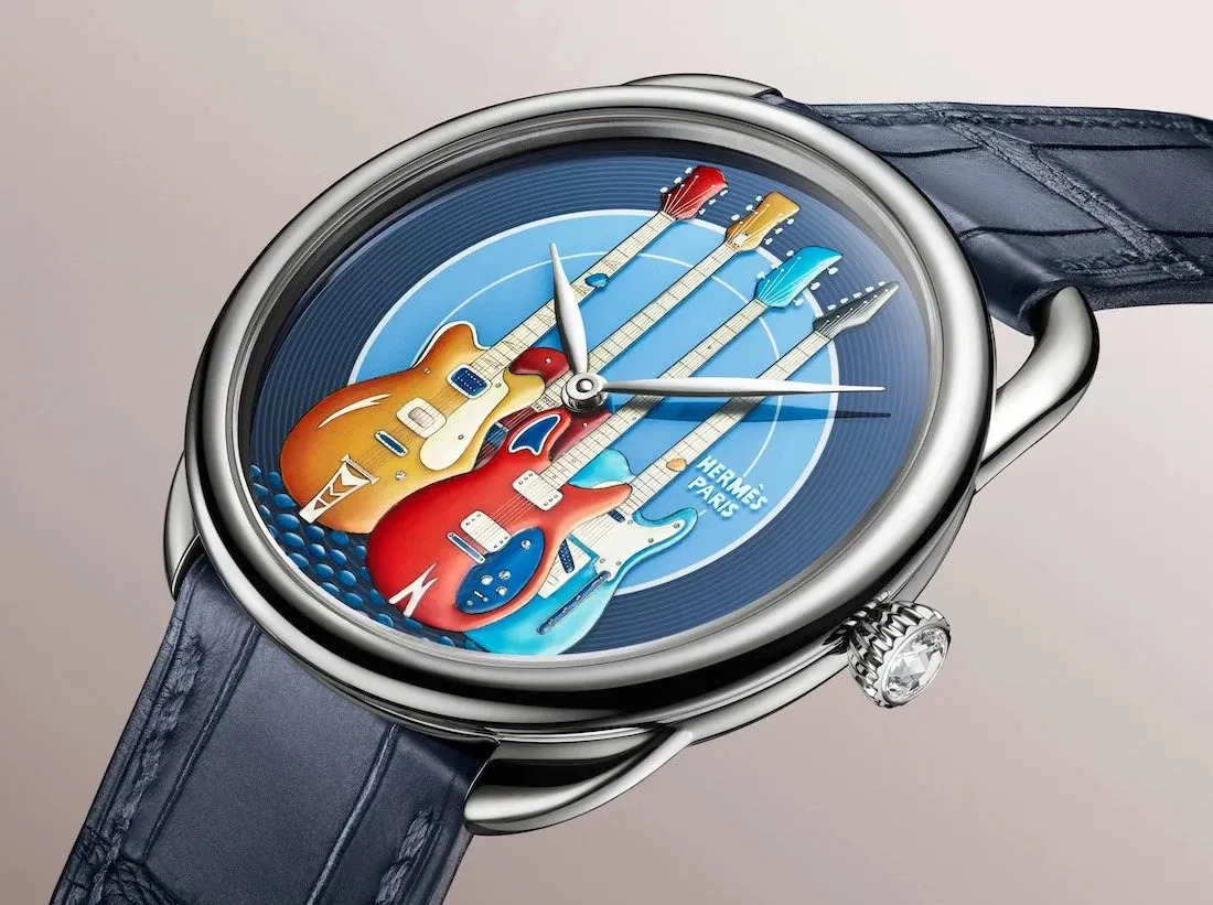 이번엔 기타 연주자들이라면 누구나 탐낼 시계를 소개한다. 그에는 나도 포함된다. 에르메스가 내슈빌 부티크 오픈을 기념해 선보인 새로운 아쏘 ‘온 에어’가 바로 그 주인공. 말에서 영감을 받은 비대칭 러그의 라운드 케이스 안에는, 컬러 비닐 레코드 형태의 사파이어 다이얼이 자리하고 있다. 다이얼에는 음반의 그루브가 패드 프린팅되어 있으며, 위에는 아티스트 카린 브랑코비츠가 디자인한 네 대의 기타가 붉은색과 파란색으로 화려하게 장식되어 있다.