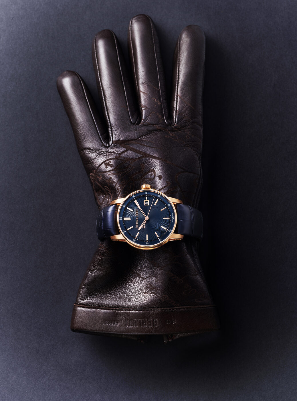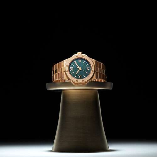 다이얼 중앙에서부터 잔물결처럼 퍼지는 파동 무늬에 수백 개의 미세한 압인양각 처리한 홀을 더해 깊이감과 입체감을 살렸다. 케이스와 3시 방향의 날짜 창, 핸즈와 인덱스는 18K 핑크 골드를 사용해 우아함을 더했다. 다이얼 컬러와 앨리게이터 레더 스트랩은 다크 블루 컬러로 매치해 통일감을 주었다. 코드 11.59 바이 오데마 피게 셀프 와인딩 5천2백40만원, 오데마 피게.