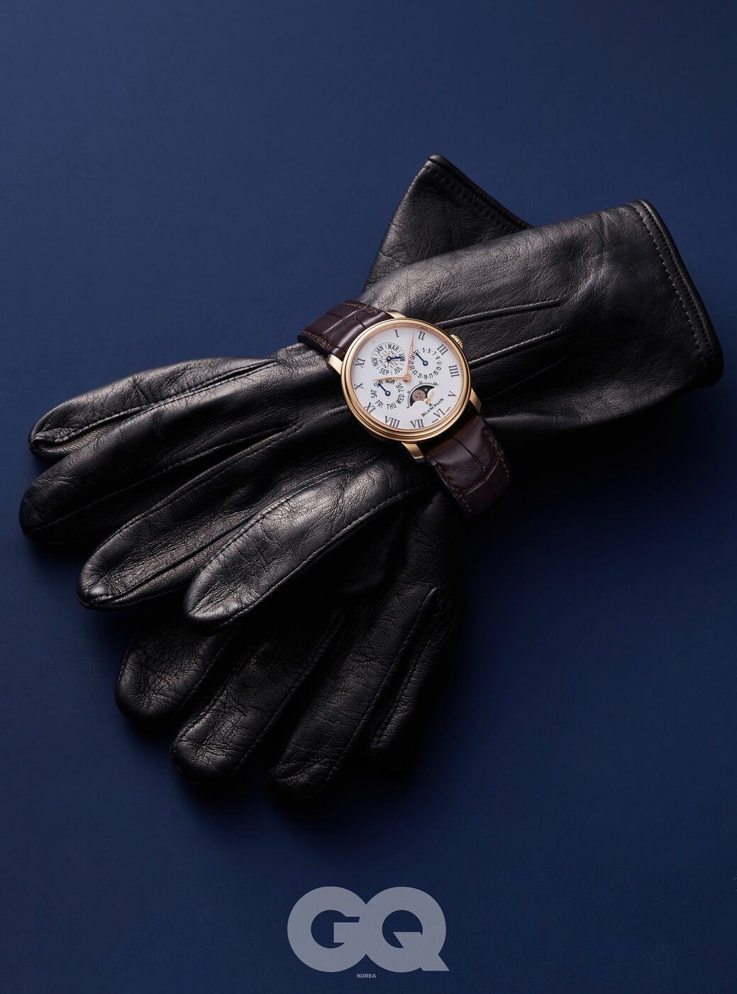 아름다움과 실용성이 만나면 이런 시계가 나온다. 화이트 그랑 푀 에나멜 다이얼에 레드 골드 케이스와 앨리게이터 레더 스트랩을 더했다. 고전적인 로만 인덱스 사이로 블랑팡의 상징인 익살스러운 표정의 문페이즈가 중심 을 잡아주고, 요일과 날짜, 월을 표시하는 퍼페추얼 캘린더가 하나의 우주 처럼 맞물린다. 빌레레 퍼페추얼 캘린더 8데이즈 9천9백52만원, 블랑팡.