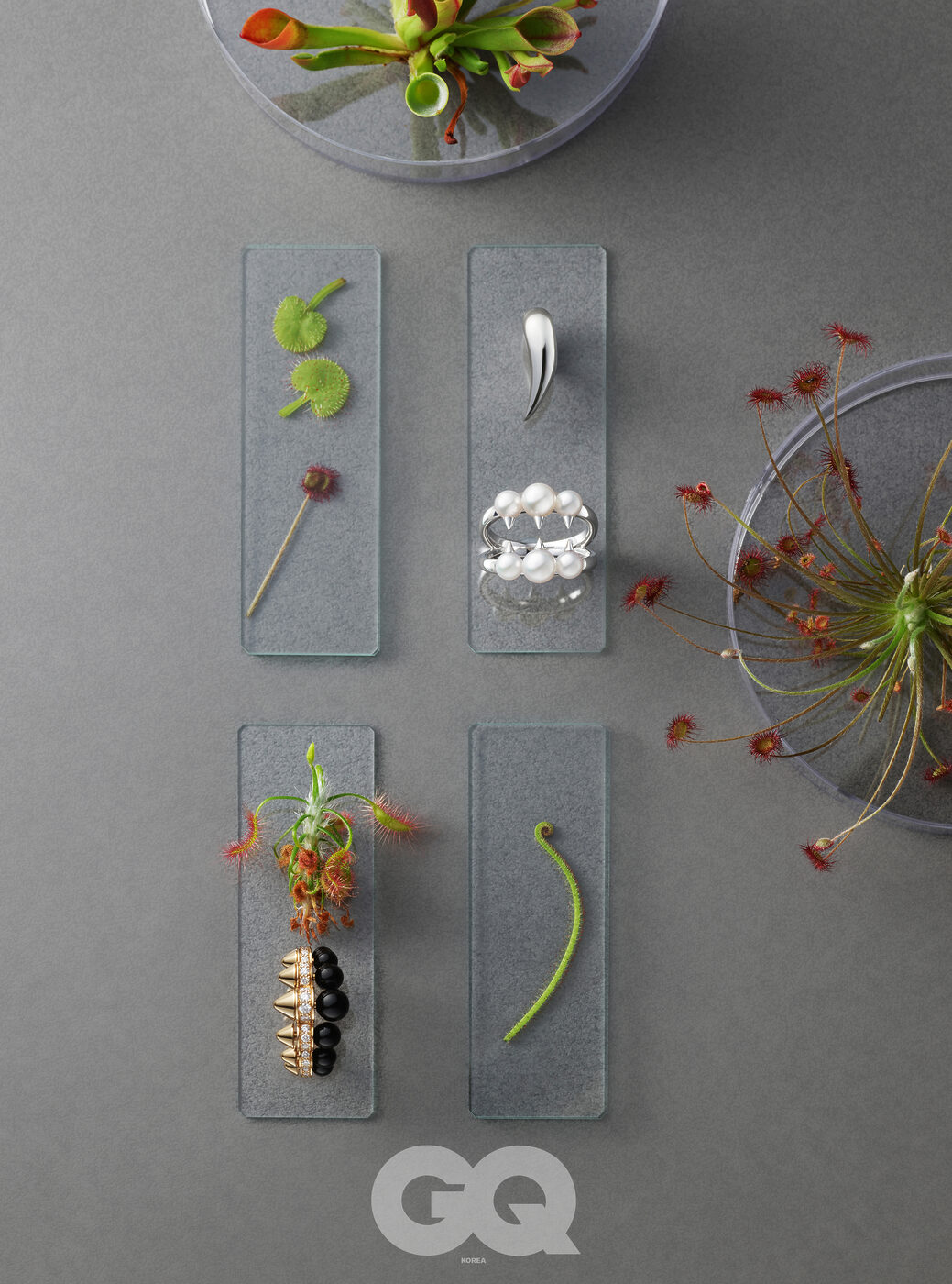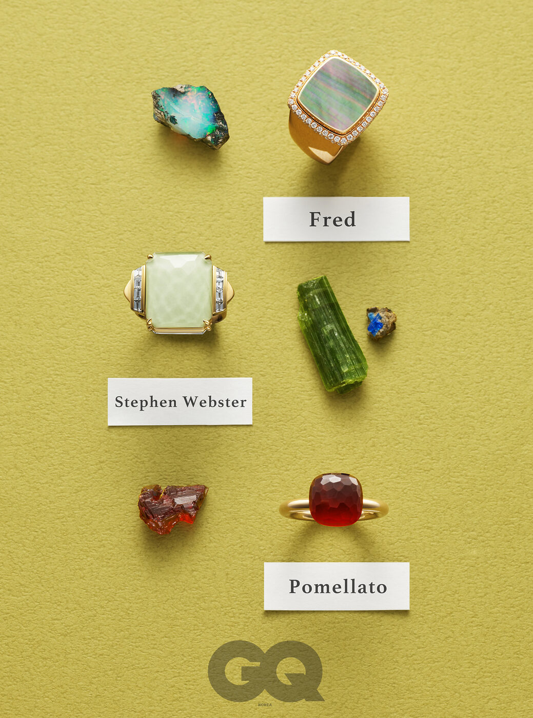 진귀한 빛의 그레이 마더 오브 펄을 따라 다이아몬드를 장식한 로즈 골드 빵 드 쉬크르 라지 링 가격 미정, 프레드. 한 쪽 면에는 레몬 쿼츠 계열의 스톤을, 다른 한 쪽 면에는 흑요석을 세팅해 투웨이로 착용 가능한 트위스터 링 가격 미정, 스티븐 웹스터. 가넷 원석을 매끈하게 세공해 대담하고도 세련된 디자인으로 완성한 누도 클래식 링 가격 미정, 포멜라토. 에티오피아산 오팔 자연석, 아프가니스탄산 투어멀린, 엘펠 산맥에서 채집한 일렉트릭 블루 하우윈석, 스페샤르타이트 가넷 원석 가격 미정, 모두 피에트로.