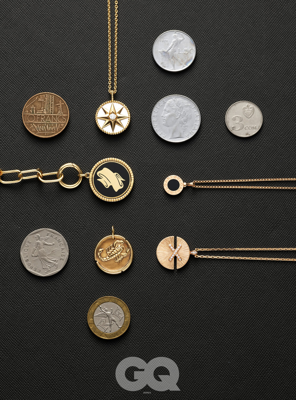 자개와 다이아몬드로 펜던트를 장식한 옐로 골드 로즈 드 방 미디엄 메달 네크리스 가격 미정, 디올 파인 주얼리. 옐로 골드에 오닉스를 더한 플립 사이드 브레이슬릿 가격 미정, 스티븐 웹스터. 로즈 골드에 블랙 오닉스로 포인트를 준 불가리 불가리 펜던트 네크리스 2백87만원, 불가리. 옐로 골드로 이루어진 전갈자리 조디악 스콜피오 메달 가격 미정, 반클리프 아펠. 옐로 골드 펜던트에 브릴리언트컷 다이아몬드를 세팅한 주 드 리앙 하모니 라지 네크리스 가격 미정, 쇼메.