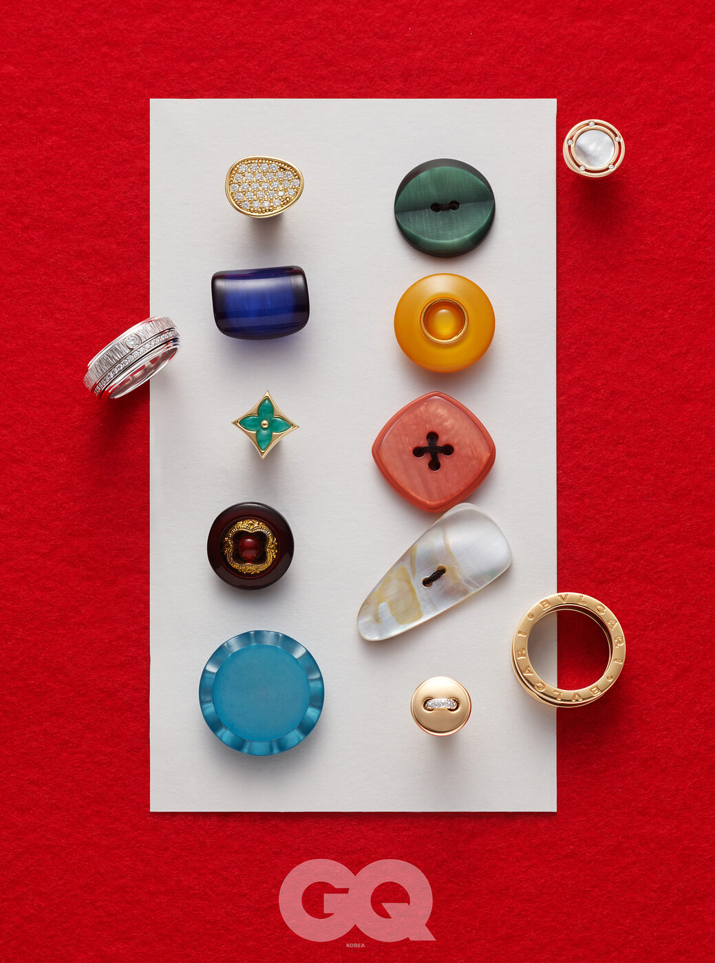 왼쪽 위부터 시계 방향으로 | 옐로 골드에 다이아몬드를 파베 세팅한 루나리아 알타 하이 주얼리 이어링 8백만원대, 마르코 비체코. 핑크 골드에 다이아몬드와 마더 오브 펄을 장식한 디사이드 이어링 가격 미정, 다미아니. 로즈 골드와 블랙 세라믹으로 이루어진 비제로원 링 2백95만원, 불가리. 버튼 모티프 로즈 골드 폼폼닷 이어링 가격 미정, 포멜라토. 핑크 골드에 말라카이트로 플라워 모노그램 모티프를 표현한 컬러 블라섬 BB 스타 스터드 이어링 가격 미정, 루이 비통 파인 주얼리. 화이트 골드에 브릴리언트컷 다이아몬드 44개를 장식한 포제션 데코 팰리스 링 1천2백70만원, 피아제.