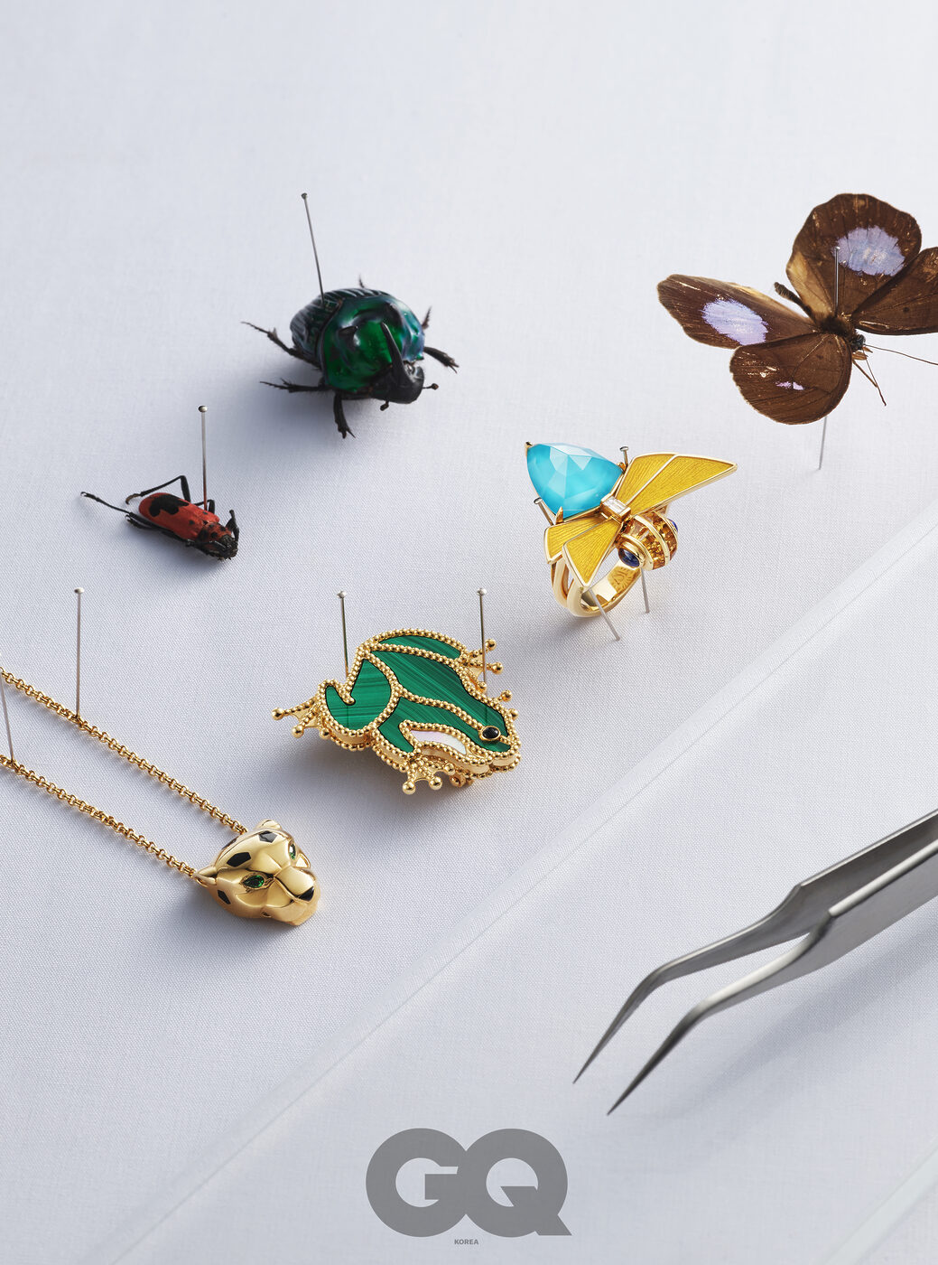 차보라이트로 빛나는 눈을 표현하고, 오닉스로 무늬를 더한 옐로 골드 팬더 드 까르띠에 펜던트 네크리스 가격 미정, 까르띠에. 말라카이트와 오닉스, 마더 오브 펄로 생동감을 불어넣은 옐로 골드 럭키 애니멀 프로그 클립 가격 미정, 반클리프 아펠. 옐로 골드에 터콰이즈, 시트린 등 각종 젬스톤과 바게트 컷 다이아몬드를 정교하게 배열한 지터버그 링 가격 미정, 스티븐 웹스터.