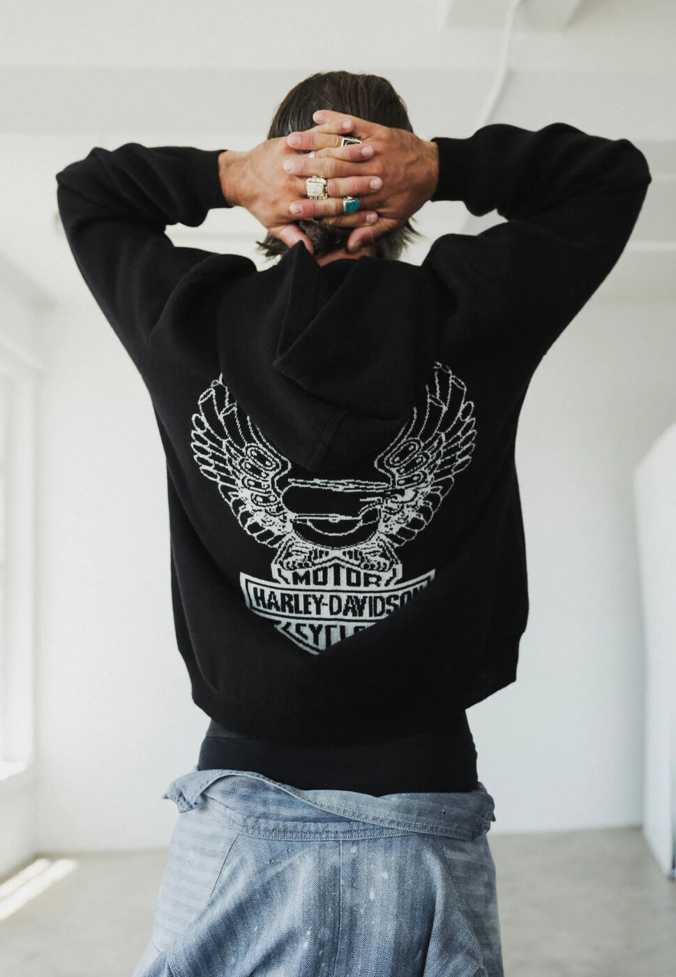 오토바이 동호회 ‘스털지스’ 같은 데서 이 협업 제품을 보게 될까? 피트는 웃으며 말한다. “글쎄요, 아닐 것 같아요. 미술 전시 오프닝 같은 데서 보게 되면 좋겠네요.” 갓즈 트루 캐시미어는 일반적인 라이더를 겨냥한 브랜드는 아니다. 그러나 열혈 바이커들은 여전히 피트를 ‘자신들 중 한 명’으로 여긴다. 그는 작은 도시에서 더트바이크를 타며 자랐고, 지금도 여러 대의 희귀한 할리를 보유한 진정한 라이더다.