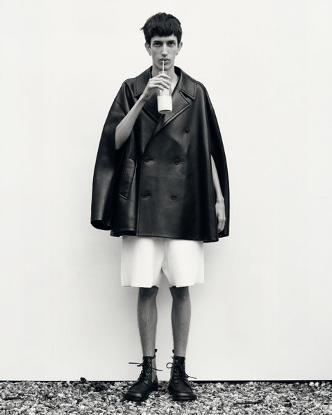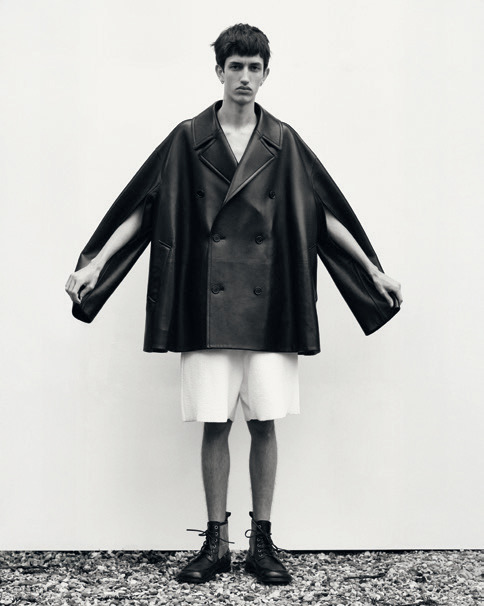 슬릿 레더 코트, 화이트 쇼츠, 레이스업 부츠, 모두 로에베.