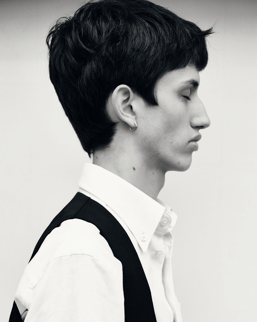 블랙 재킷, 그레이 셔츠, 스트라이프 팬츠, 더비, 벨트, 모두 생 로랑 by 안토니 바카렐로.