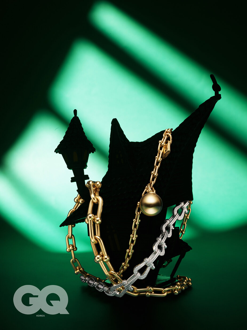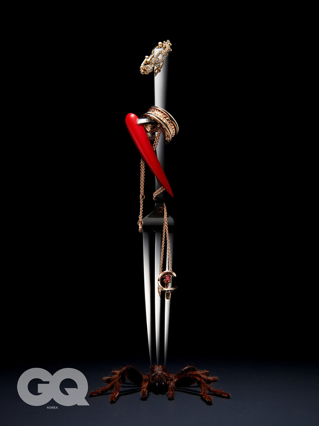 18K 옐로 골드에 1.32캐럿의 다이아몬드를 파베 세팅한 티파니 하드웨어 스몰 링크 링 가격 미정, 티파니. 18K 로즈 골드와 블랙 세라믹으로 이루어진 비제로원 락 투 밴드 링 4백81만원, 불가리. 코코 펜던트에 루비로 포인트를 준 18K 베이지 골드 코코 크러쉬 네크리스 가격 미정, 샤넬 파인 주얼리. 스테인리스 스틸 네일 포크 5만8천원, 누플랏.