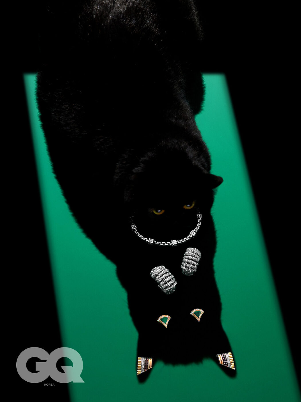 화이트 골드 트렁크 모티프에 다이아몬드를 넣은 레 가스통 비통 브레이슬릿 가격 미정, 루이 비통 파인 주얼리. 오벌 실루엣의 18K 화이트 골드에 다이아몬드를 파베 세팅한 파노라마 이어링 가격 미정, 포페. 18K 로즈 골드에 말라카이트와 다이아몬드로 광채를 더한 디바스 드림 이어링 5백20만원, 불가리. 18K 옐로 골드, 화이트 골드, 핑크 골드와 브라운 PVD 및 다이아몬드로 이루어진 콰트로 클래식 다이아몬드 스터드 이어링 가격 미정, 부쉐론.