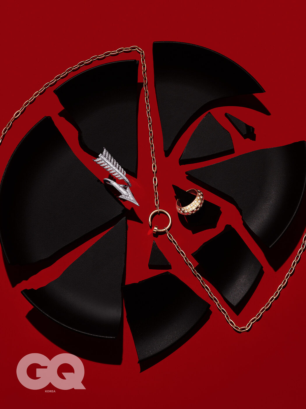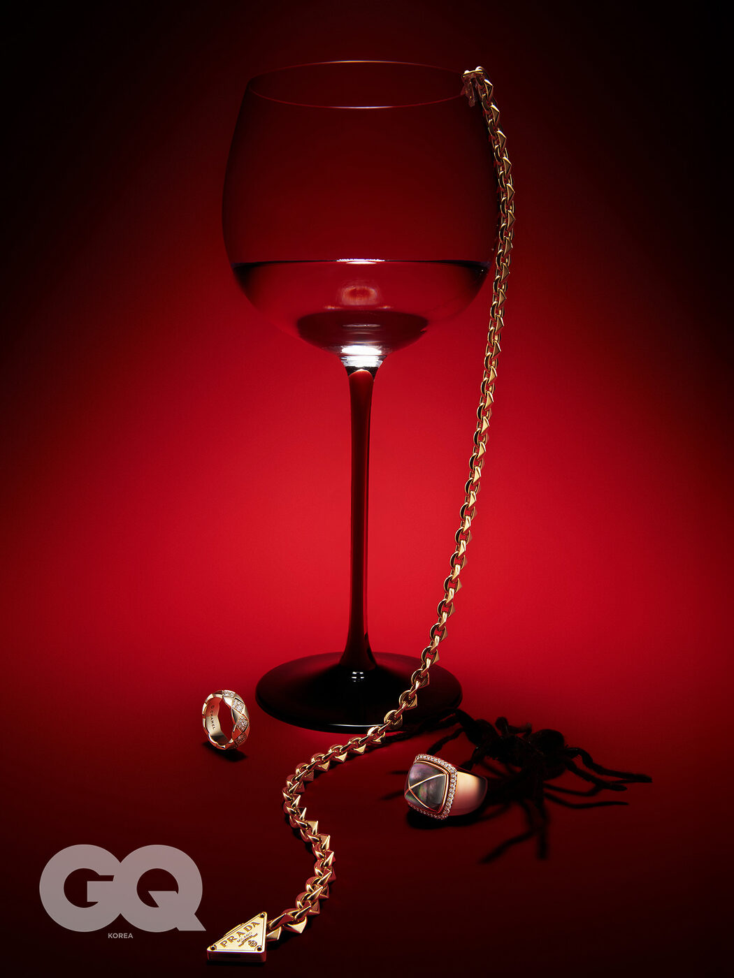 18K 베이지 골드에 퀼팅 모양으로 다이아몬드를 세팅한 코코 크러쉬 스몰 링 가격 미정, 샤넬 파인 주얼리. 트라이앵글 모티프를 링크로 연결한 옐로 골드 이터널 체인 네크리스 가격 미정, 프라다 파인 주얼리. 핑크 골드에 그레이 마더 오브 펄과 다이아몬드를 장식한 빵 드 쉬크르 링 1천9백4만원, 프레드. 레드타이 오크드 샤르도네 24만원, 리델.