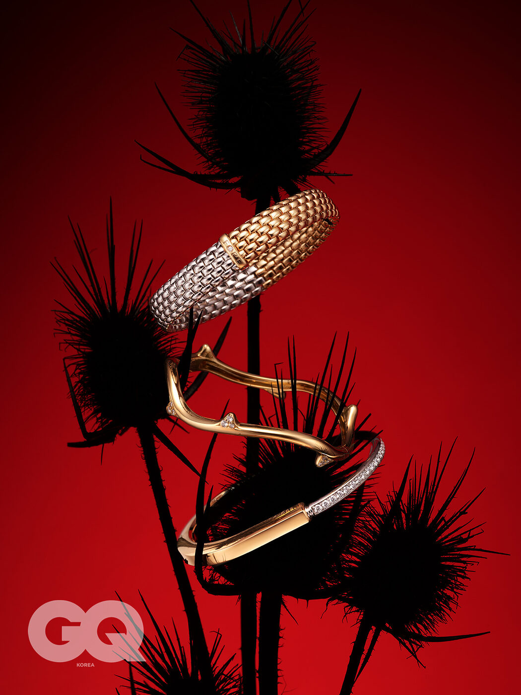 18K 로즈 골드와 화이트 골드를 신축성 있는 메시 조직으로 디자인한 바이 컬러 메시 플렉스잇 브레이슬릿 가격 미정, 포페. 장미 넝쿨을 형상화한 옐로 골드 브아 드 로즈 브레이슬릿 가격 미정, 디올 파인 주얼리. 18K 로즈 골드와 화이트 골드에 다이아몬드를 하프 세팅한 티파니 락 뱅글 가격 미정, 티파니.