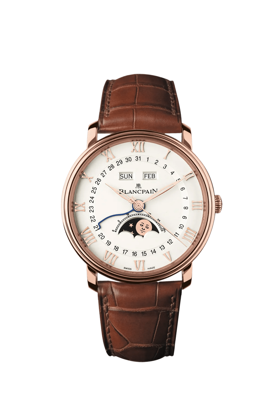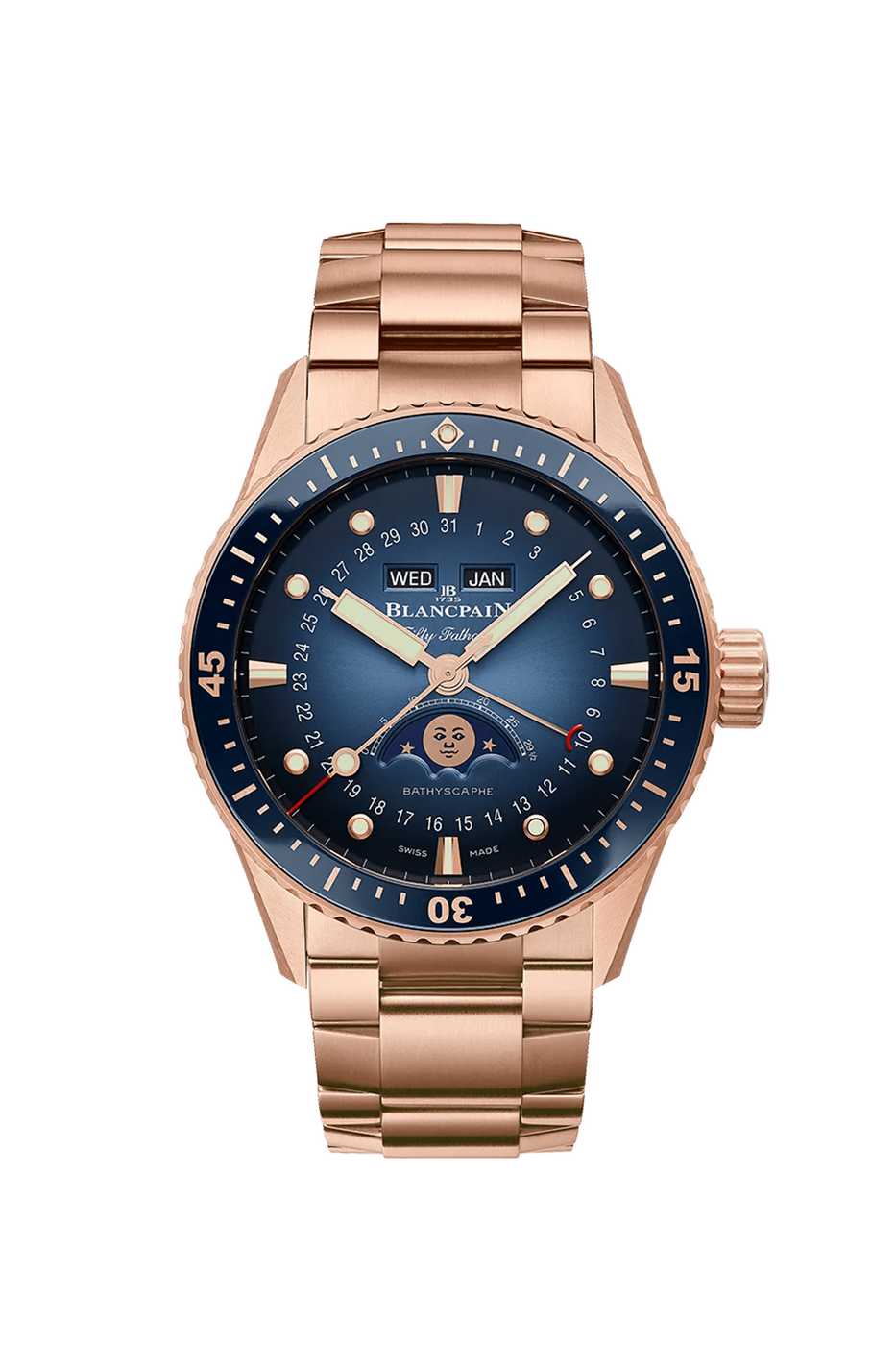 2022년 블랑팡과의 동행을 알리는 영상에서 손종원이 착용한 시계는 ‘바티스카프 컴플리트 캘린더 문페이즈’다. 케이스는 43mm의 18캐럿 레드 골드로 제작됐고, 칼리버 6654.P.4로 구동된다. 파워 리저브는 72시간. 은은한 그라데이션 효과가 들어간 선버스트 블루 다이얼에는 컴플리트 캘린더, 문페이즈, 세컨즈 컴플리케이션이 정교하게 어우러져 있다. 8,334만원.