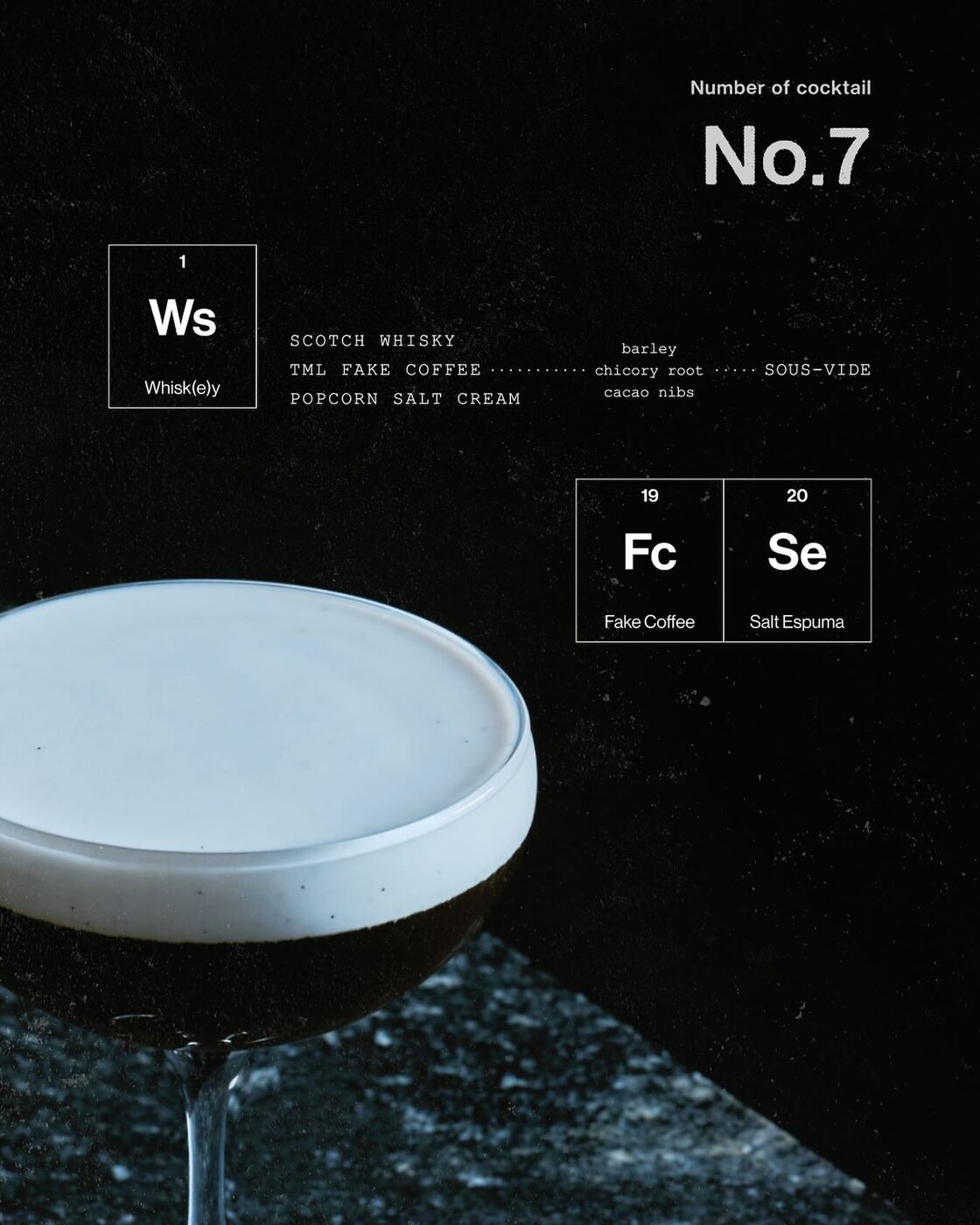 COMMENT 과학 실험실처럼 화학 기호로 표현하고 생각지 못한 조합으로 만들어내는 칵테일이 인상 깊다. 모든 메뉴는 숫자로 표기하는데, 특히 시그니처 넘버 No.7 칵테일을 추천한다. 재료에 커피가 적혀 있어 커피콩이나 칼루아를 쓰겠다 싶겠지만 앞에 붙은 ‘TML Fake’, 즉 ‘더믹스랩 페이크’가 진실이다. 커피를 넣지 않고 커피 맛을 구현한다. 셰이킹, 빌드 같은 기본 기법을 넘어 진공 증류하는 로토밥, 초음파 진동 소닉랩, 원심분리기 등 새롭고 모던한 테크닉을 경함하는 재미도 크다.