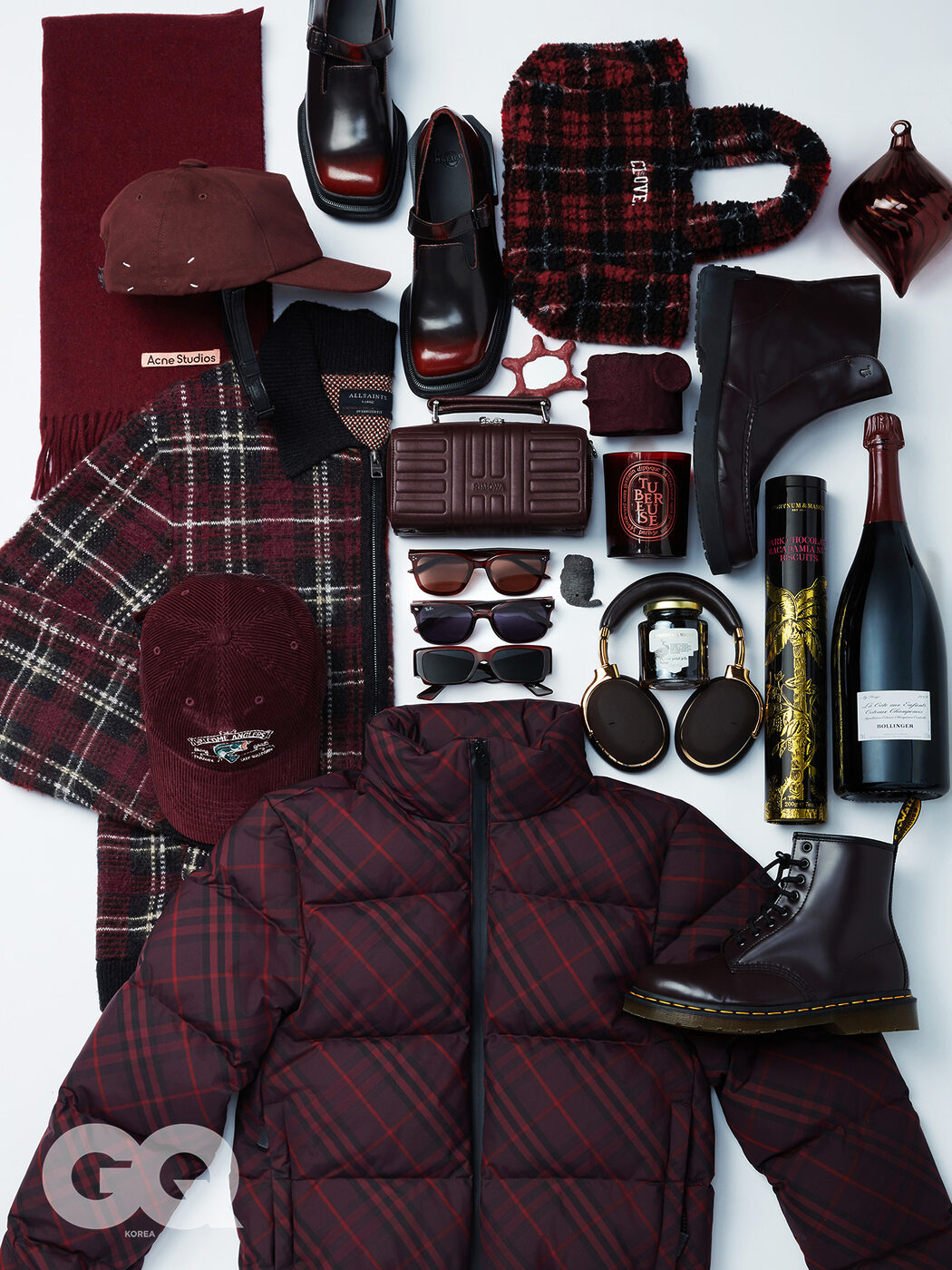 1 울 스카프 가격 미정, 아크네 스튜디오. 2 스트랩 장식 볼 캡 가격 미정, 메종 마르지엘라. 3 메이볼 메리제인 슈즈 22만원, 닥터마틴. 4 타탄체크 보아 토트백 6만9천원, 클로브. 5 타탄체크 집업 카디건 가격 미정, 올세인츠. 6 코듀로이 볼 캡 4만2천원, 와일드 브릭스. 7 크로스 보디 스몰 백 가격 미정, 리모와. 8, 9 기하학 형태의 손거울, 손잡이 장식의 미니 팟 가격 미정, 모두 오유우. 10 레더 부츠 가격 미정, 토즈. 11 바이 로우 RC3 선글라스 28만9천원, 젠틀 몬스터. 12 웨이페어러 선글라스 20만1천원, 레이밴 by 에실로룩소티카. 13 직사각 프레임 선글라스 60만7천원, 올리버피플스 by 에실로룩소티카. 14 강아지 인센스 홀더 가격 미정, 오유우. 15 튜베루즈 캔들 14만9천원, 딥티크. 16 로즈페탈 젤리 가격 미정, 포트넘앤메이슨. 17 베오플레이 헤드폰 2백62만5천원, 뱅앤울룹슨. 18 다크 초콜릿 마카다미아넛 비스킷 가격 미정, 포트넘앤메이슨. 19 1500밀리리터 라 꼬뜨 오 장팡 스파클링 와인 가격 미정, 볼렝저. 20 엠블사이드 체크 푸퍼 재킷 가격 미정, 버버리. 21 8홀 레더 레이스업 부츠 26만원, 닥터마틴.