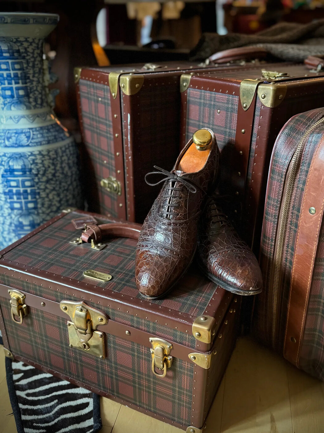 “이 희귀한 스튜어트 타탄 하드쉘 러기지 세트는 제 컬렉션 중에서도 보물 같은 존재입니다. 최근 아내와 함께한 로드트립에도 가져갔어요. 이 러기지는 한 음악 업계 거물의 유산 경매에서 얻었는데, 그 사람은 아마 프린스를 계약시킨 인물이었고, 말년에는 마사 스튜어트의 미디어 회사 회장이었죠. 그가 세상을 떠난 후, 저는 롱아일랜드의 개츠비 같은 대저택으로 가 이 러기지를 찾아왔습니다. 일부에는 뉴욕 칼라일 호텔 주소가 적힌 태그도 달려 있었어요. 그걸 보며 ‘아, 예전엔 롱아일랜드 집에서 칼라일까지 이 폴로 타탄 러기지를 들고 이동했다니, 정말 멋졌겠다’라고 생각했죠.”