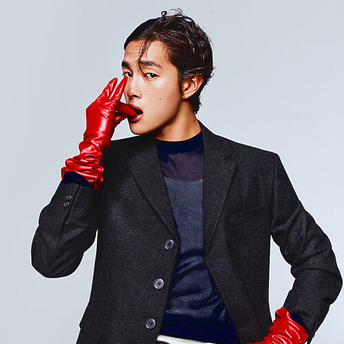 퍼 코트, 스카이 블루 셔츠, 블랙 터틀넥, 울 플레어 팬츠, 모두 발렌티노. 넥타이, 벨트, 레드 앤 블랙 체커 반스 어센틱, 모두 발렌티노 가라바니.