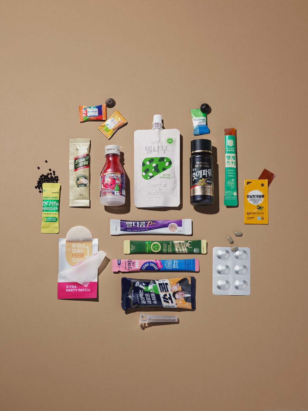 위부터 ① 인디언구스베리 추출물에 5가지 식물성 원료를 더한 파티스마트 구미 3만원(10개입), 히말라야. ② 아이스플랜트 추출물이 아세트알데하이드 농도를 21.4퍼센트까지 낮추는 이지 스마트 구미 5천원(3개입), 동국제약. ③ 헛개나무 열매 혼합 농축액을 원료로 한 컨디션환 5만8천원(20개입), 이노엔. ④ 숙취 해소에 특화된 16가지 원료를 한 포에 담은 젤리스틱 칸씨슬 파워 1만9천원대(10개입), 뉴트리디데이. ⑤ 간 해독에 도움을 주는 7가지 성분을 함유했다. 소주와 섞어 마시거나, 하이볼 또는 칵테일로 맛있게 즐길 수 있는 숙희해수 플러스 세트 4만5천원(45ml×9개입), 숙희해수. ⑥ 산겨릅나무 줄기 추출물이 혈중 독성 농도를 감소시키는 파우치 형태의 음료 숙취엔벌나무 5만원(80mlx20개입), 지아나 앤 오드리. ⑦ 유산균 발효 마늘 추출 분말과 헛개나무 열매 농축액으로 만든 헛개파워 5천원(100ml), 광동제약. ⑧ 탱글한 식감의 사과맛 헛개스틱 5만원(100개입), 주주총회 헛개확깨. ⑨ 타우린, 헛개나무 열매 농축액이 구강 내 점막을 통해 빠르게 흡수되는 모닝헛개필름 3만4천원대(21매입), 미쁨생활건강. ①⓪ 밀크씨슬, 글루타치온, 타우린 등을 겔타입 패치에 녹인 엑스트라 파티 패치 3만3천원(10매입), 햅. ①① 작약 뿌리, 황기 등 10가지 성분을 초고농축으로 담은 알디콤 플러스 2만1천원대(5개입), 알디콤. ①② 초저분자 식물성 원료가 숙취를 빠르게 잡아주는 액상 형태 숙취 해소제 5만4천원대(14개입), 아사이치케아. ①③ 글루타치온에 밀크씨슬, 아티초크 등을 더한 제로 슈거 상쾌한 스틱 제로 1만4천원대 (10개입), 큐원. ①④ 말린 헛개 열매를 그대로 담은, 꽂아 마시는 숙취 해소제 1만8천원 (5개입), 쏘콕. ①⑤ 고농축 히말라야 원료를 알약 형태로 담은 K2 히말라야 숙취 해소제 30정 4만7천원대, 랩온랩.