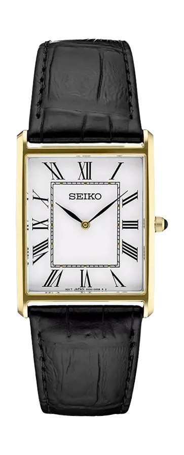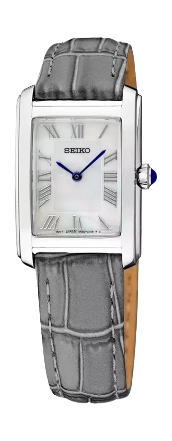 일본 브랜드 세이코의 SWR 시리즈는 탱크와 똑 닮은 여러 디테일을 담고 있다. 직사각형 페이스, 로마 숫자 인덱스, 카보숑 크라운, 악어 가죽 패턴의 레더 스트랩까지.