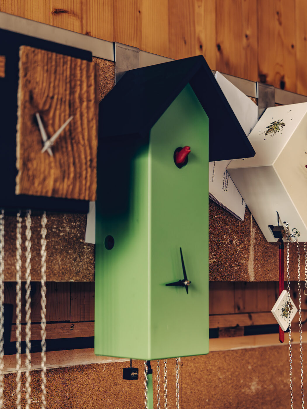 뻐꾸기시계도 새롭게 단장하고 있다. 특히 쇠나흐 Schonach라는 마을에는 세계에서 가장 큰 뻐꾸기시계가 있다. 블랙 포레스트의 전통 가옥을 본뜬 이 시계는 지름이 3미터 정도다. 1백 년 전만 해도 이 마을에는 1천 명이 넘는 시계 장인들이 있었다. 하지만 2015년 들어 상황이 완전히 뒤바뀌었다. 10분의 1 가격에 판매되는 중국산 제품과의 경쟁으로 뻐꾸기시계 산업은 침체기에 빠졌다. 1894년부터 가업으로 시계를 만들어온 롬바스&하스 Rombach&Haas는 이러한 상황에 품격 있게 대응해왔다. 그들은 여전히 1일 또는 8일 태엽 방식으로 작동하며 에델바이스와 같은 멜로디에 맞춰 뻐꾸기 울음소리를 내는 시계를 정교하게 제작하고 있다. 동시에 가문의 딸인 셀리나 크라이어 Selina Kreyer가 ‘셀리나 하스 디자인’이라는 독자 브랜드를 만들어 새로움을 더했다. 크라이어는 현대 미술 작품, 캔버스 페인팅, 오브제와 뻐꾸기시계를 자유롭게 결합한다. 시계 앞면을 라임색으로 칠하거나 만화의 한 장면을 넣기도 한다. “기계 구조는 250년 전과 똑같아요.” 조각난 시계 부품, 작은 발레리나 인형, 붉은 뻐꾸기 장식들이 가득 쌓인 작업실에서 그녀는 말한다.