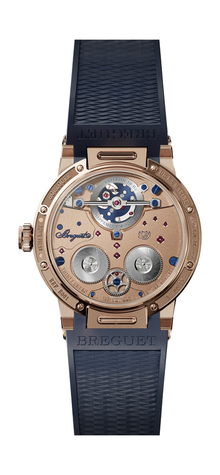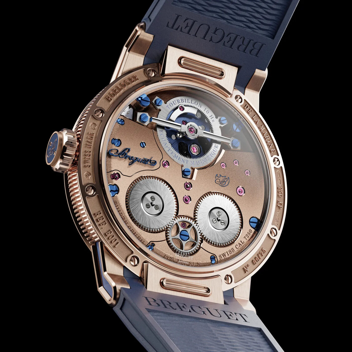 익스페리멘탈 1은 아브라함-루이 브레게의 혁신을 한 단계 끌어올린 모델이다. 그는 1795년경, 중력의 영향을 상쇄하기 위해 시계 무브먼트를 회전시키는 케이지인 투르비용을 발명했다. 브레게의 새 시계는 이 개념을 ‘고진동 투르비용’으로 발전시켰다. 또한 완전히 새로운 자기 이스케이프먼트도 개발했다. 이 새로운 무브먼트는 브랜드의 스포츠 라인인 마린의 43.5mm 케이스에 담겼고, 브랜드 최초로 편안한 러버 스트랩과 함께 조합되었다.