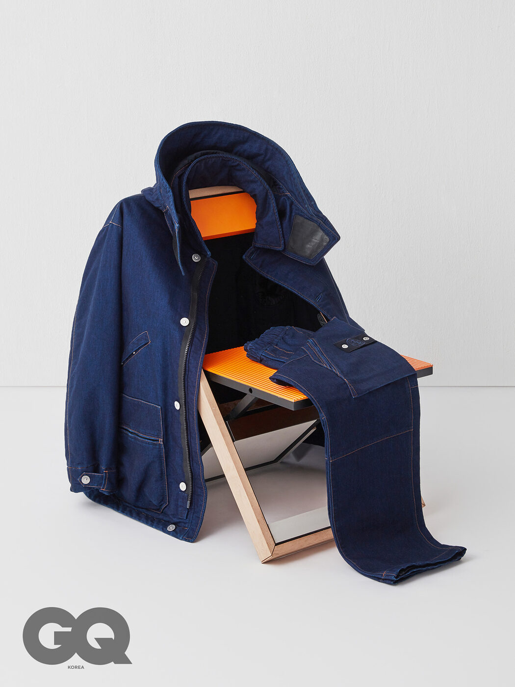 탈착 가능한 바이저 후드와 투웨이 지퍼로 다양한 연출을 할 수 있다. 속이 비어 있는 구조의 폴리프로필렌 원사로 직조해 가벼운 무게와 선명한 컬러를 자랑하는 패딩 안감의 데님 라이트 쇼트 파카 2백95만원, 삼각형 플랩과 사선 포켓으로 입체감을 살리고, 스냅 버튼과 콘트라스트 스티치로 디테일을 강조한 린스 가공 데님 카고 팬츠 1백만원, 모두 스톤 아일랜드. 파우더 코팅으로 선명한 컬러를 더한 오크 우드 폴딩 체어 가격 미정, 정유종.
