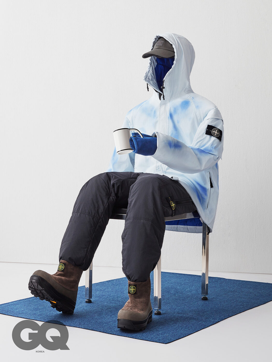 온도에 반응해 색이 변하는 기능성 재킷. 내부는 방풍 및 방수 처리해 외부 환경을 차단하고, 슬리브와 후드에는 탈착할 수 있는 테리 소재를 더해 보온성을 강화한 아이스 재킷 써모센시티브 4백9만원, 부드러운 립스톱 나일론 6.6 소재에 발수와 패딩 기능을 더해 실용성을 강화한 루스핏 패딩 조거 1백13만원, 스웨이드 카프 가죽과 러버 밴드로 이루어진 비브람 솔 앵클부츠 1백32만원, 다크 그레이 로고 패치 베이스볼 캡 40만원, 모두 스톤 아일랜드. 라인 머그 3만8천원, 누플랏. 스테인리스 스틸과 목재로 제작한 ●/■ 001 체어 가격 미정, 유기석.
