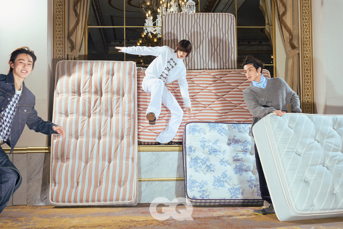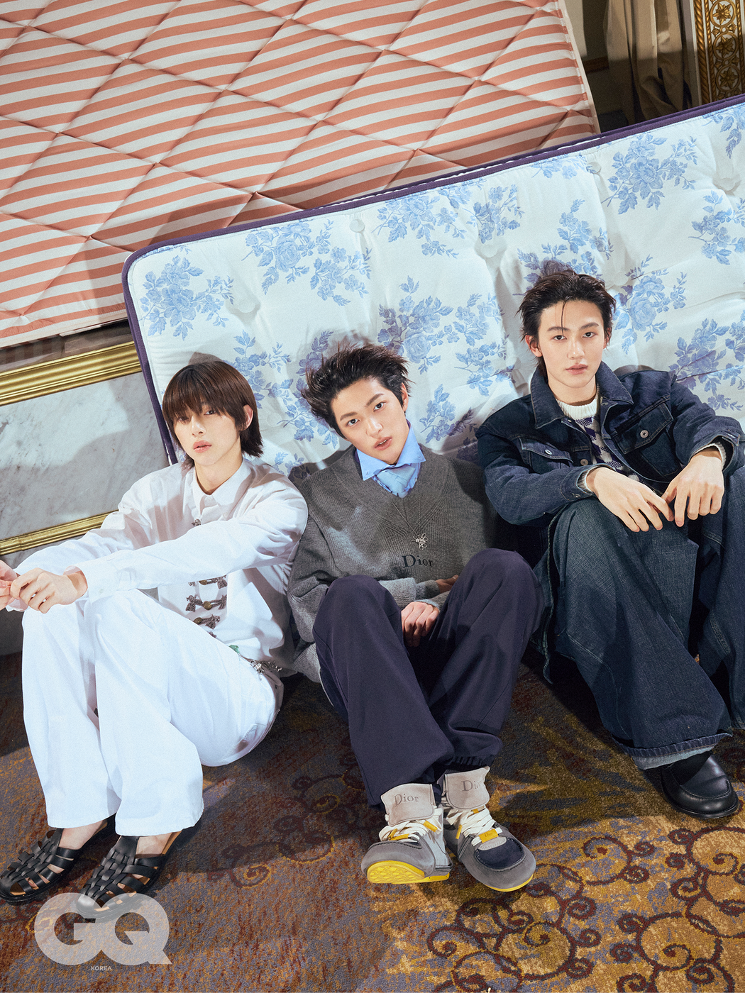 맨 부츠 가격 미정, 모두 디올. 왼쪽부터ㅣ화이트 버진 울 맨 크루넥 톱, 베이지 코튼 캔버스 맨 카프리 진, 블루 라지 노트 맨 넥밴드, 그레이 스웨이드 디올 로디 레이스업 맨 부츠, 메탈 버튼 화이트 맨 셔츠, 화이트 코튼 맨 부츠컷 진, 블랙 디올 알 마레 맨 샌들, 라이트 핑크 캐시미어 맨 크루넥 톱, 화이트 포플린 맨 셔츠, 레드 맨 치노 팬츠, 베이지 스웨이드 디올 로디 레이스업 맨 부츠, 화이트 실크 맨 보타이와 맨 스카프, 다크 블루 맨 블루종과 맨 카프리 진, 하운드 투스 맨 크루넥 톱, 블랙 디올 아치 맨 로퍼, 화이트 실크 맨 스카프, 그레이 알파카 맨 브이넥 톱, 블루 옥스퍼드 맨 셔츠, 네이비 맨 카고 팬츠, 그레이 스웨이드 디올 로디 레이스업 맨 부츠, 다이아만틴 실크 엘드리지 노트 맨 타이, 스털링 실버 쿠튀르 참 맨 네크리스 가격 미정, 모두 디올.화이트 버진 울 맨 크루넥