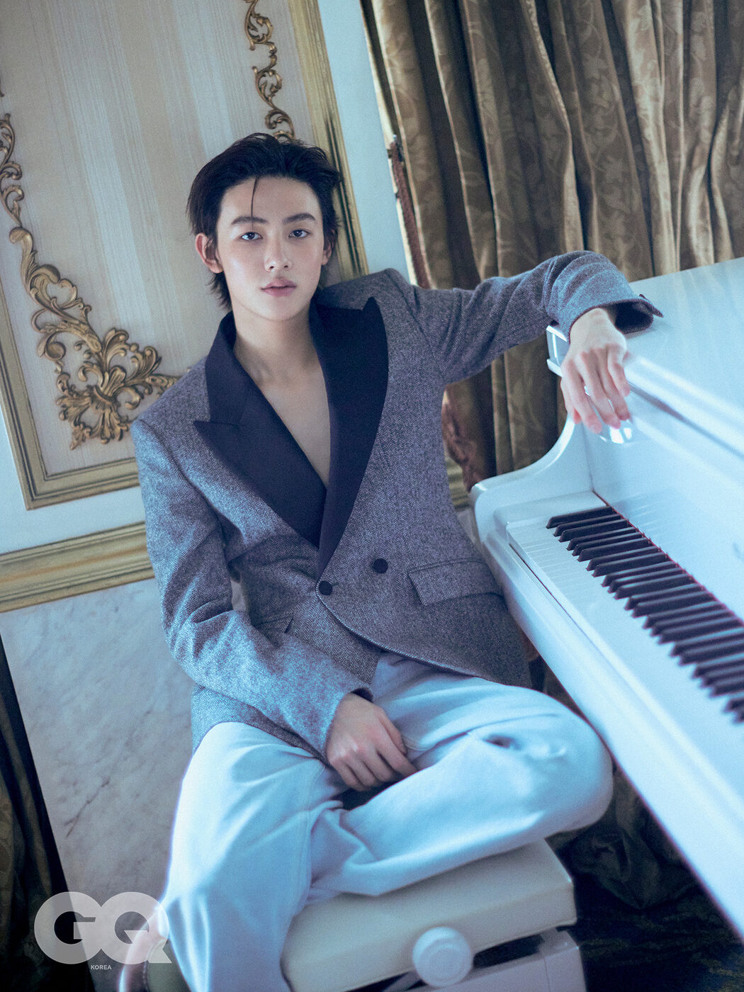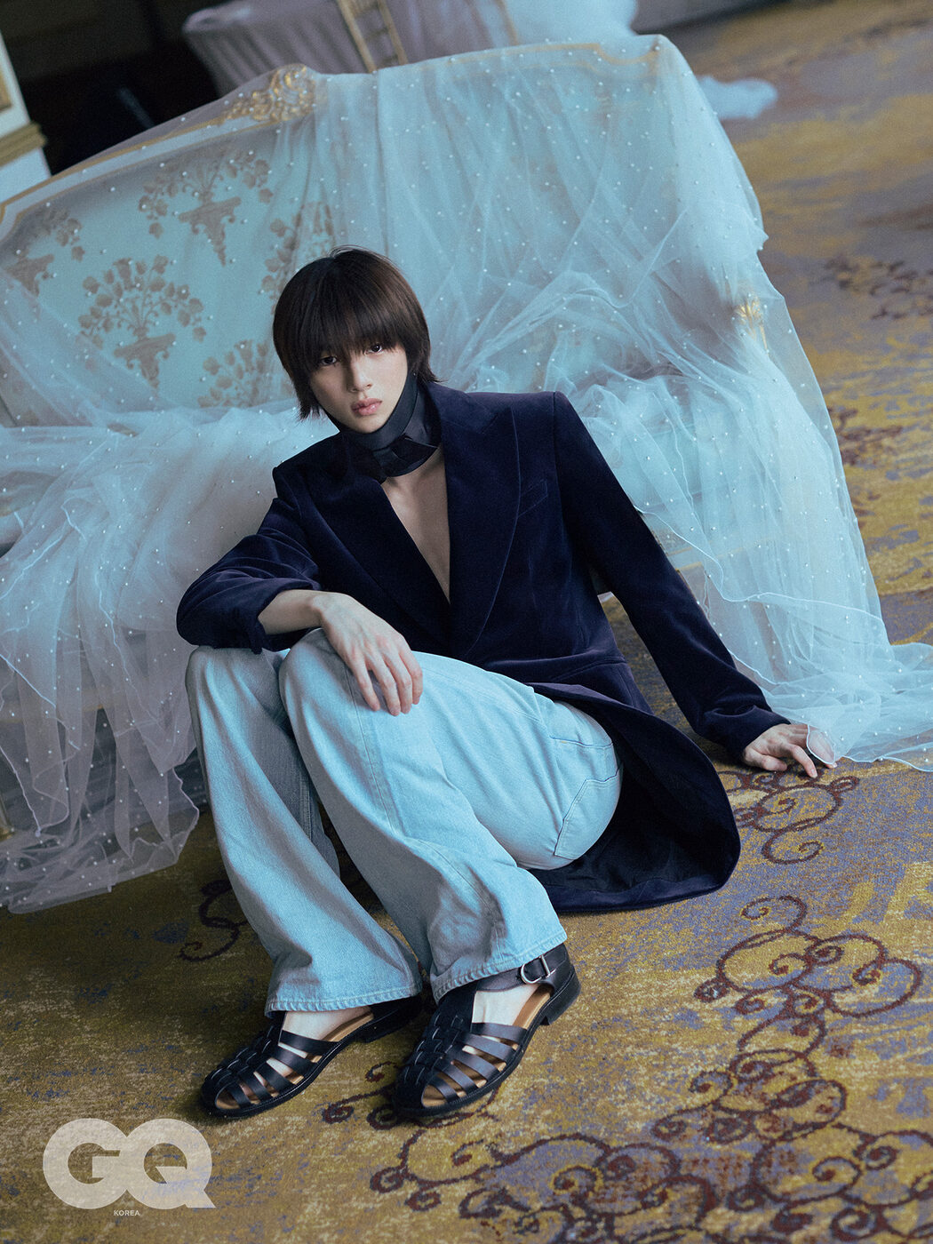 넥밴드 가격 미정, 모두 디올. 피크트 라펠 벨벳 모닝 맨 재킷,