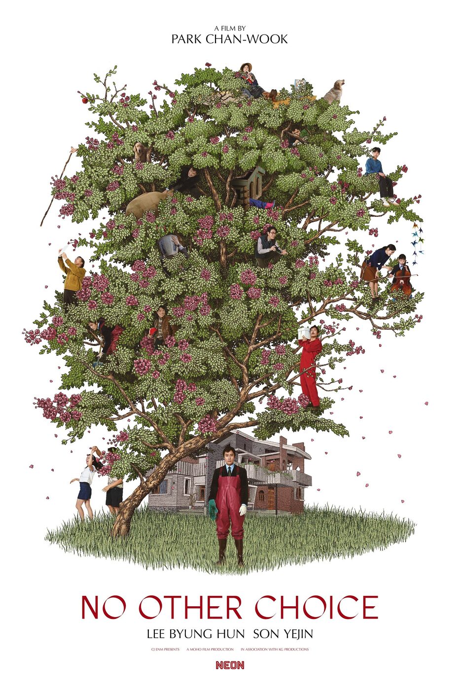 두 번째는 한국 영화 최초로 골든글로브 작품상 후보에 오르는 쾌거를 달성한 박찬욱 감독의 [어쩔 수가 없다]. 주인공 만수(이병헌)를 중심으로 다양한 사연과 성격을 지닌 캐릭터들이 꽃을 활짝 피워내는 커다란 배롱나무 곳곳에 숨은 듯 배치된 포스터는 아름답게 느껴지는 동시에 약간 기묘한 느낌도 나는 것이 블랙 코미디 작품의 특징을 잘 담아냈다. 포스터는 기획을 총괄한 그래픽 디자인 스튜디오 ‘스테디’의 스케치 배치에 맞춰 연여인 작가의 촘촘한 드로잉, 비밀을 간직한 인물과 소품으로 호기심을 자극하는 삽화가 더해져 완성되었다. 원작 시나리오 단계에서는 나무뿌리가 등장인물들을 감싸고 있는 이미지를 구상했는데, 완성된 영화를 본 후 방향을 바꿔 땅 위로 자라나는 나무의 모습에 초점을 맞추게 되었다고. 특히 포스터의 핵심인 배롱나무는 만수의 내면과 거친 성장 과정을 형상화한 상징으로, 꽃은 만개했지만 가지는 비틀린 모습으로 담아내 그 의미를 더한다. 배롱나무의 나무껍질은 조금 더 매끄러워야 한다는 등 일반 사람들은 알아채지 못할 만한 디테일에 집중한 박찬욱 감독의 피드백과 제안 덕분에 포스터의 완성도가 더욱 높아졌다는 후문이다.