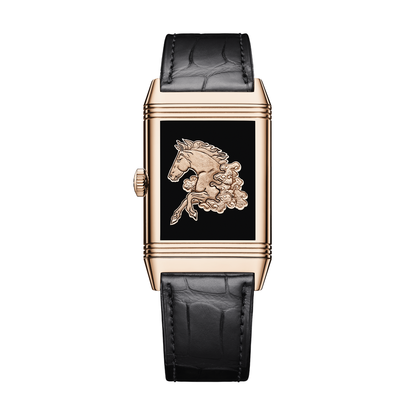 예거 르쿨르트는 말의 해를 기념, 현대 중국 회화의 거장 쉬베이홍의 작품 ‘서 있는 말’을 리베르소 뒷면에 재현했다. 케이스백을 회전시키면 6겹의 블랙 그랑 푀 에나멜 위에 수작업을 통해 새긴 황금빛 말이 그 존재감을 뽐낸다. 장인이 10개의 서로 다른 크기의 끌을 사용해 약 80시간에 걸쳐 완성한 모델링 인그레이빙이 인상적인 타임피스. 무브먼트는 오토메팅 방식의 매뉴팩처 칼리버 822가 탑재됐다. 정확한 가격은 문의 시 제공.