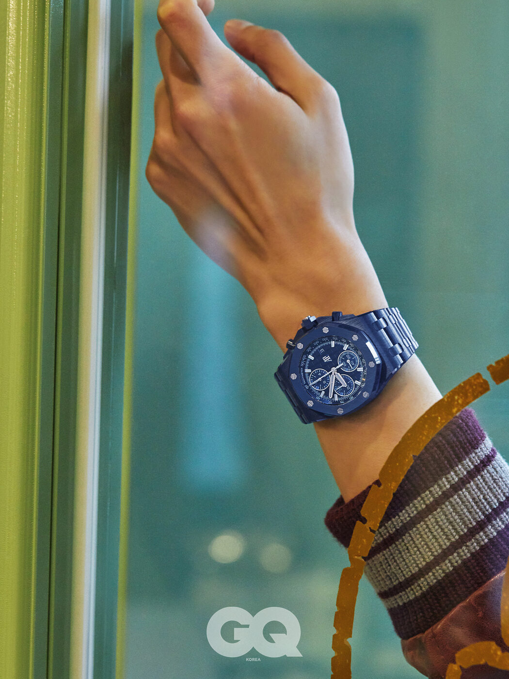 오데마 피게의 시작인 발레드주의 깊은 밤하늘에서 영감 받은 시계. ‘블루 뉘, 뉘아주 50’이라 명명한 푸른 다이얼 위로 슈퍼 루미노바를 도포한 18K 화이트 골드 핸즈와 아워 마커가 마치 밤하늘의 별처럼 표표한 빛을 뿜는다. 세 개의 크로노그래프 카운터와 70시간 파워 리저브를 보장한다. 로열 오크 오프쇼어 셀프 와인딩 크로노그래프 1억 3천3백38만원, 오데마 피게.