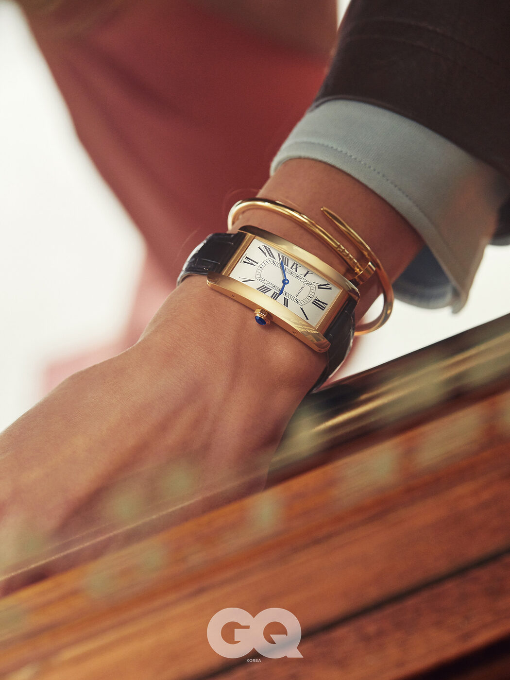 브라운 레더 재킷과 셔츠 가격 미정, 모두 아미리. 저스트 엥 끌루 블레이슬릿 1천2백만원, 까르띠에.