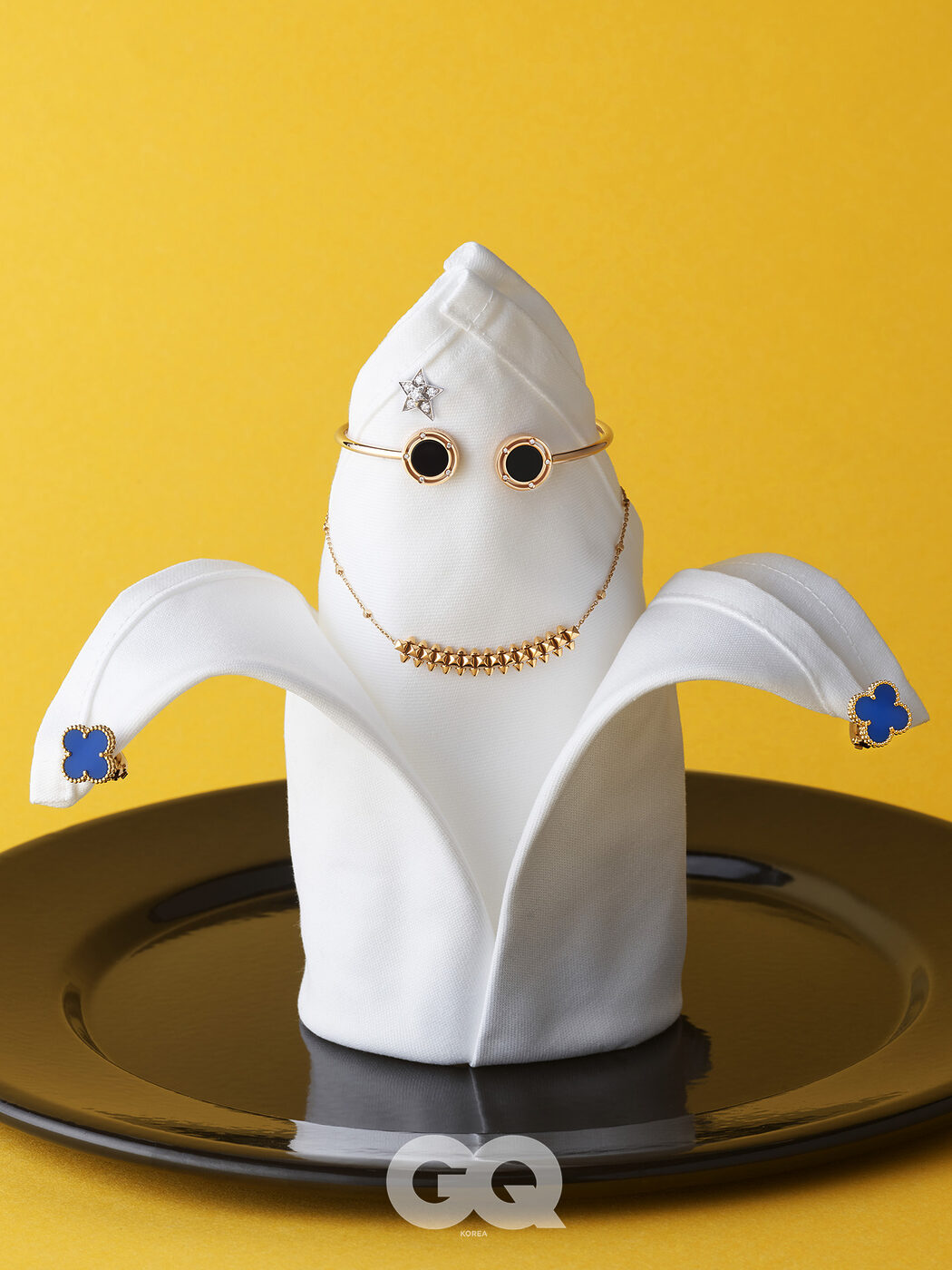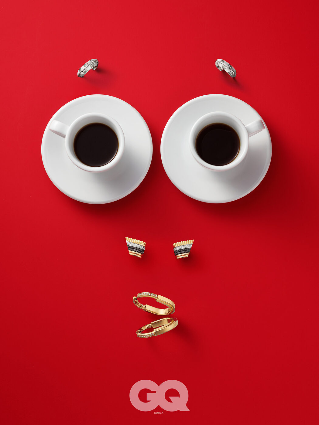 하늘에서 본 방돔 광장을 18K 화이트 골드와 블랙 래커, 다이아몬드로 표현한 리즈네 스터드 이어링 1천만원대, 부쉐론. 로즈 골드에 다이아몬드를 세팅한 세르펜티 바이퍼 이어링 1천7백90만원, 불가리. 18K 옐로 골드로 이루어진 골드 티파니 하드웨어 그레듀에이티드 링크 네크리스 가격 미정, 티파니. 아이웨어 48만원, 모스콧.