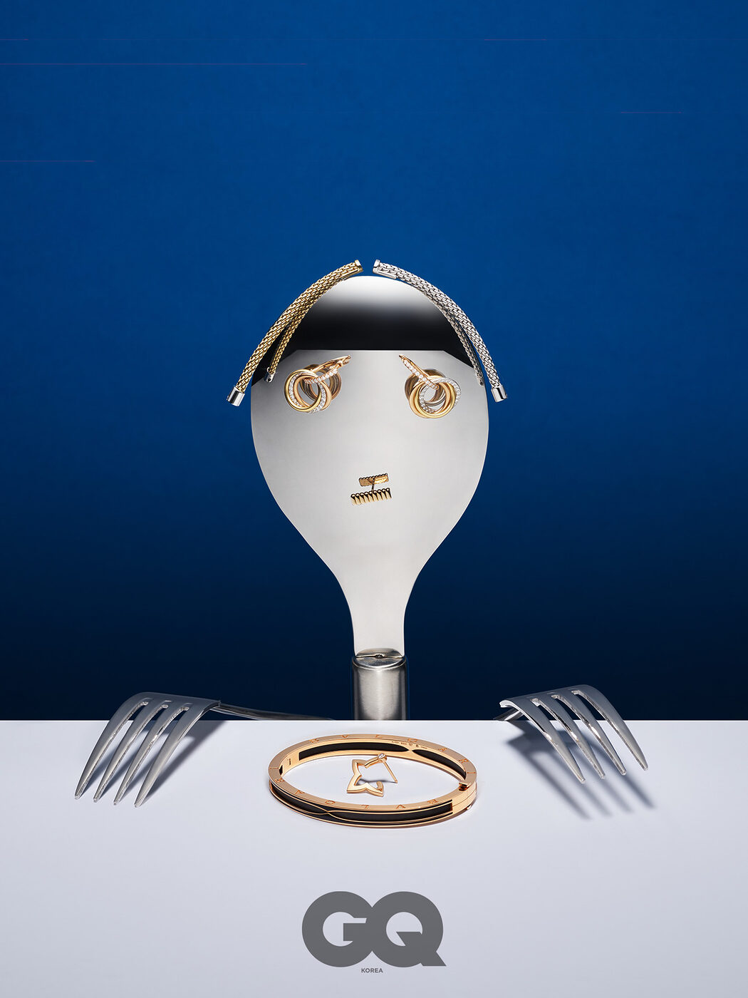 플래티늄과 18K 옐로 골드, 다이아몬드로 자유롭게 나는 새를 우아하게 구현한 버드 펜던트 티파니 버드 온 어 락 네크리스 가격 미정, 티파니. 핑크 골드에 브릴리언트컷 다이아몬드와 오닉스를 더한 디사이드 이어링 가격 미정, 다미아니. 핑크 골드에 다이아몬드를 세팅한 마이 디올 싱글 이어커프 가격 미정, 디올 파인 주얼리. 별의 움직임을 표현한 18K 사쿠라 골드 키네틱 브로치 가격 미정, 타사키. 18K 옐로 골드에 튀르쿠아즈와 다이아몬드로 광채를 더한 부채 모티프 디바스 드림 이어링 5백35만원, 불가리. 링 디저트 포크 2만8천원, 웨이브 디저트 스푼 1만8천원, 모두 누플랏.