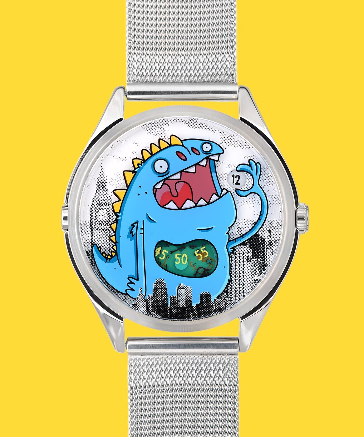 도시에 괴물이 나타났다! 그런데 이 괴물, 식성이 독특하다. 다른 게 아니라 숫자를 잡아먹고 있다. 벌써 뱃속엔 한가득 숫자 더미가 들었다. 놀라지 마라. 홈페이지에 따르면, 이 괴물의 주식은 시계 속의 숫자다. 괴물이 손에 쥐고 있는 숫자는 시침, 괴물의 뱃속 중앙에 있는 숫자는 분침으로 읽으면 된다. 지금, 무엇이 내 시간을 장악하고 있는가, 상상의 여지를 남기는 재미있는 오토매틱 워치. 캐릭터 디자이너 오노리오 디에피로가 디자인한 모델. 275 파운드(한화로 약 55만 원).