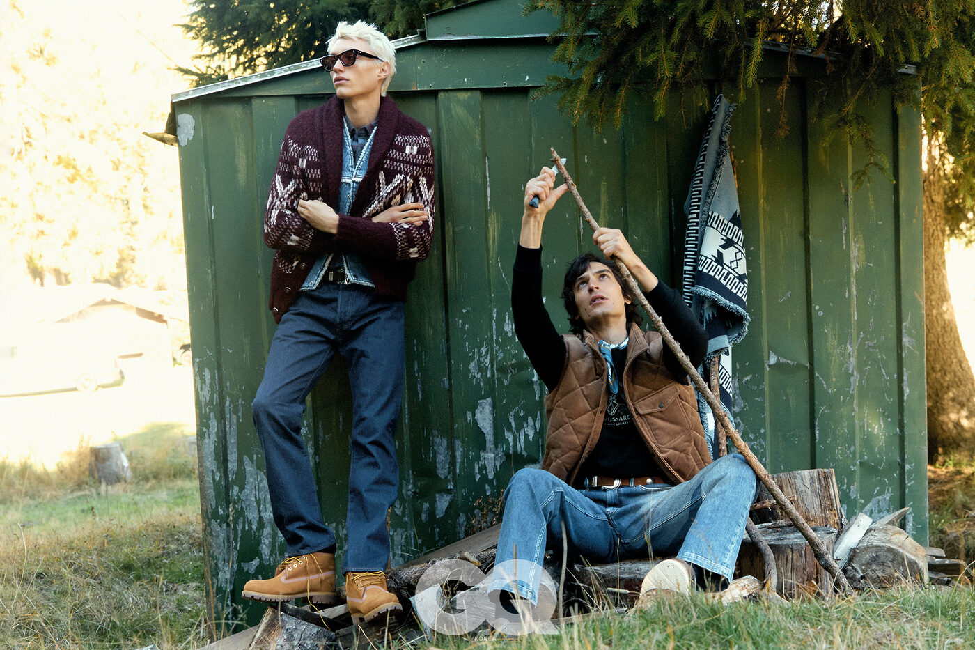 자카드 카디건, 브루넬로 쿠치넬리. 데님 베스트와 셔츠, 진, 모두 리바이스. 블랙 선글라스, 아코니. 레이스업 부츠, 팀버랜드. 브라운 퀼팅 베스트, 보기. 스웨트셔츠와 진, 모두 트루사르디. 카디건, 나무에 걸어 놓은 자카드 카디건, 알라누이. 벨트, 포르텔라. 스카프, 에르메스.