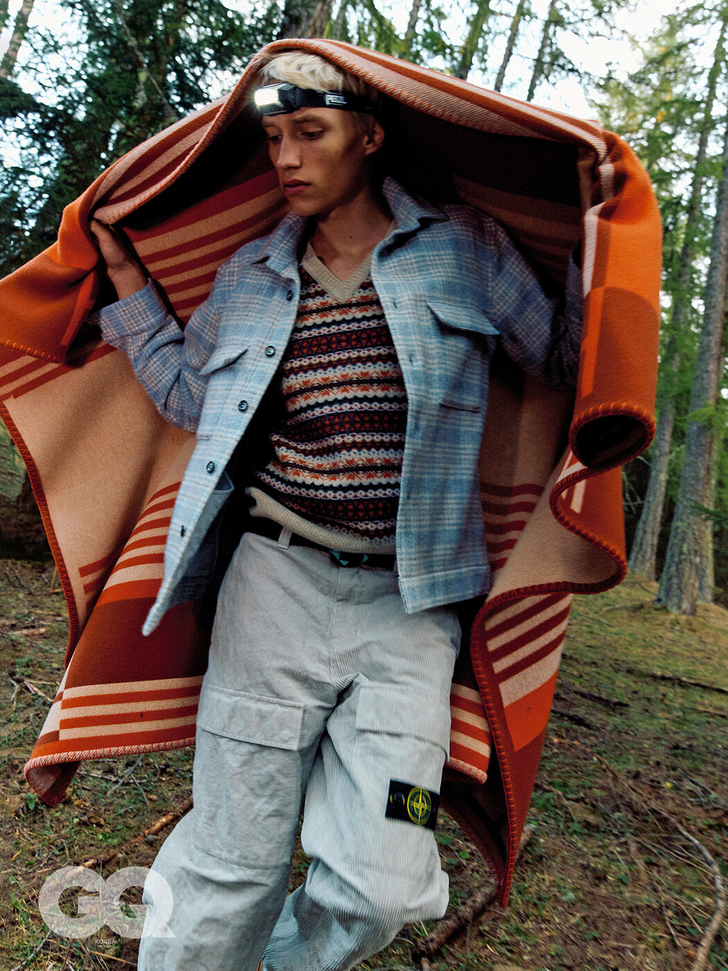 블루 셔츠, 자쿠스. 니트 베스트, 세바고. 카고 팬츠, 스톤 아일랜드. 벨트, 포르텔라. 캐시미어와 울로 이루어진 블랭킷, 에르메스.
