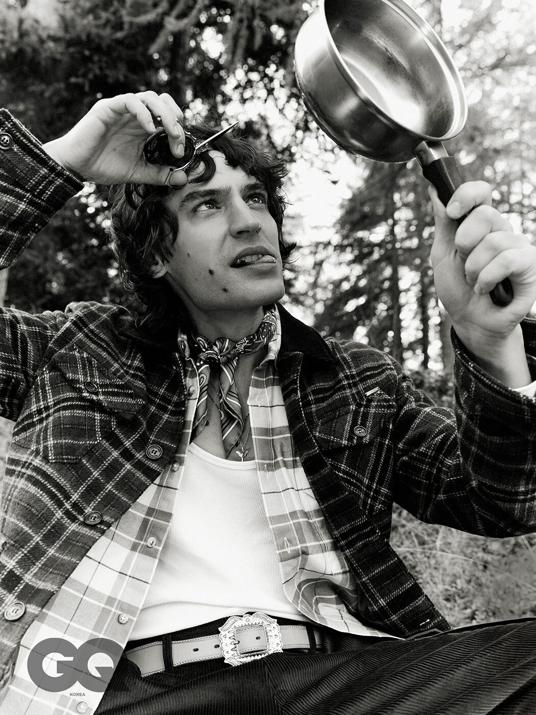 플레이드 오버 셔츠, 지아니루포. 이너로 입은 플레이드 셔츠, 노스 세일즈. 화이트 탱크톱, 캘빈클라인 언더웨어. 팬츠, 엠씨에스. 벨트, 포르텔라.