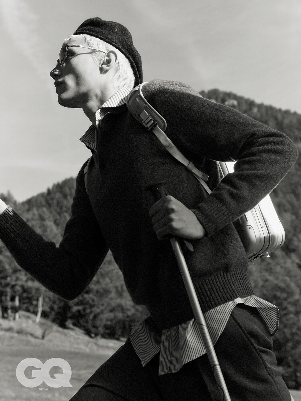 스트라이프 셔츠, 니트 톱과 팬츠, 베레, 모두 로로피아나. 아이웨어, 캠퍼랩. 오리지널 알루미늄 백팩, 리모와, 트레킹 스틱, 마스터즈.
