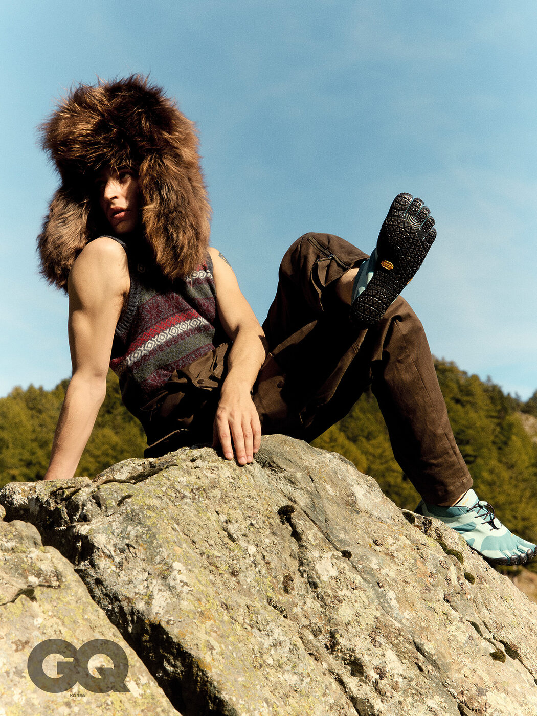 니트 베스트, 하몬트 앤 블레인. 점프 수트, 몽클레르. 트루퍼 햇, 에트로. 파이브핑거스 슈즈, 비브람.