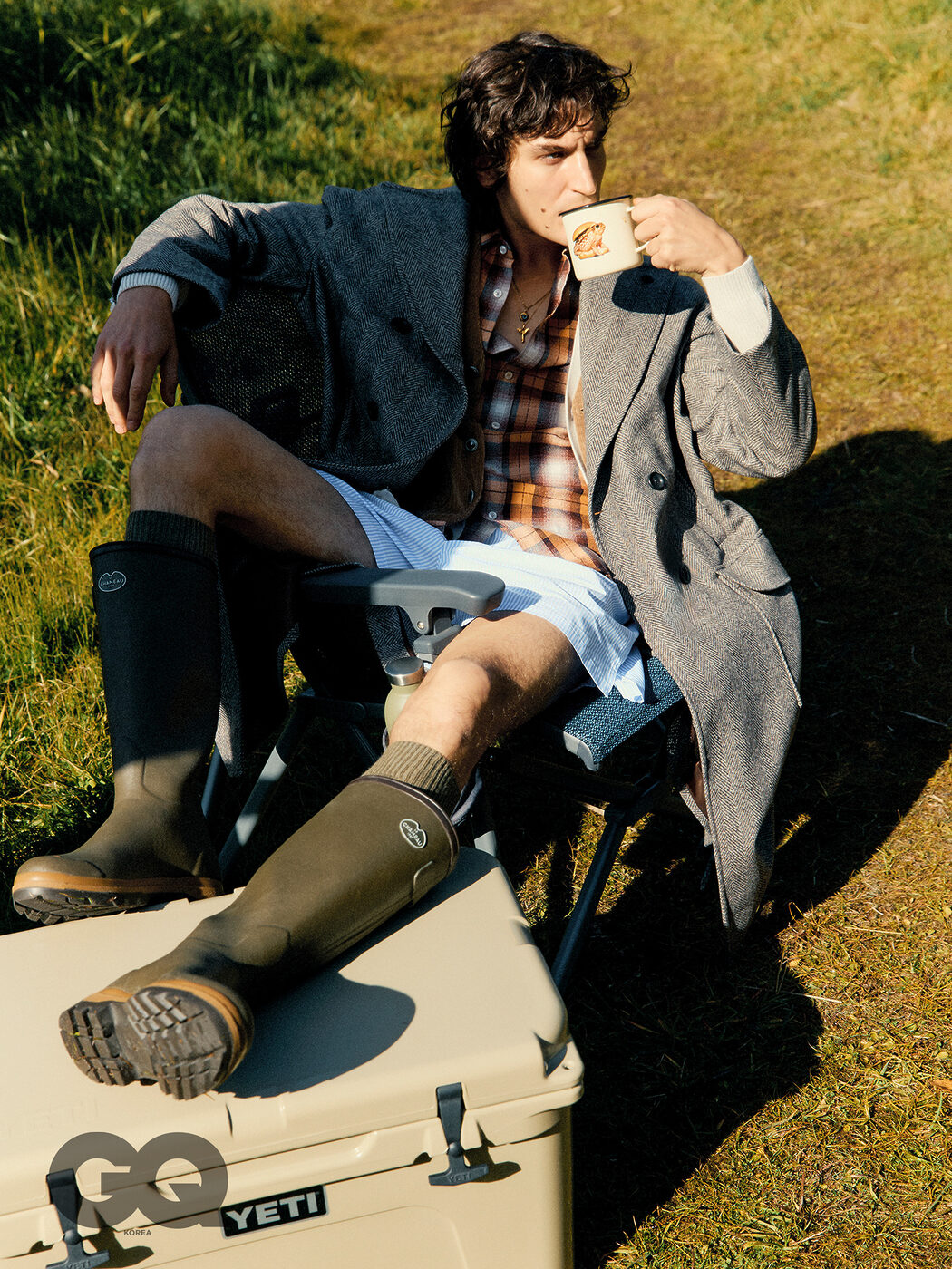 그레이 코트와 스카이 블루 카디건, 모두 아웃핏 이탈리아. 베스트, 지아니루포. 플레이드 셔츠, 자쿠스. 스트라이프 복서, 간다라. 러버 부츠, 로로피아나. 카키 니삭스, 페로필. 캠핑 체어, 아이스박스, 모두 예티. 물컵, 셀레티 토일릿페이퍼 홈.