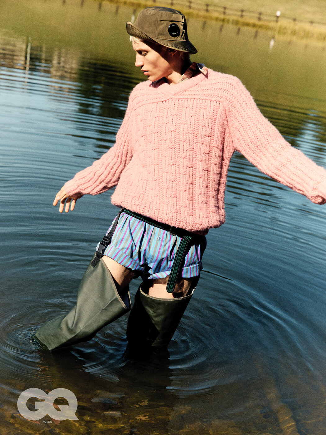 핑크 니트, 까날리. 플레이드 셔츠, 세바고. 스트라이프 브리프, 간다라. 버킷 햇, 씨피컴퍼니. 벨트, 에트로.