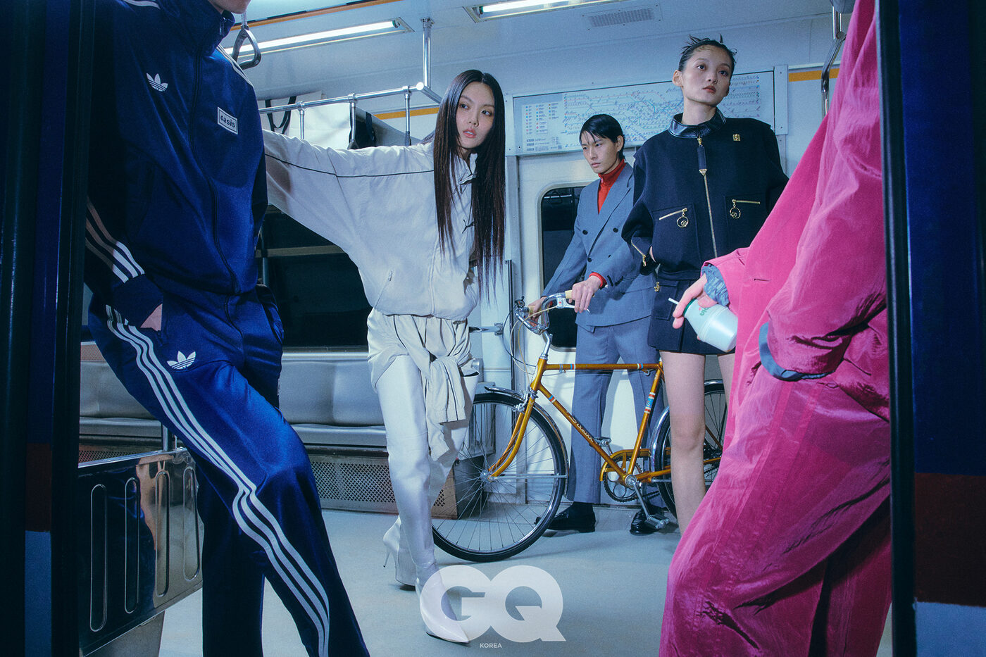왼쪽부터 | 오아시스 투어 파이어버드 트랙 수트 가격 미정, 모두 아디다스 오리지널스. 화이트 푸마 트랙 수트 재킷과 스커트, 화이트 부츠 가격 미정, 모두 발렌시아가. 그레이 수트, 레드 트랙 재킷, 블랙 로퍼 가격 미정, 모두 프라다. 네이비 재킷과 미니 스커트 가격 미정, 모두 루이 비통. 핑크 수트 가격 미정, 모두 마틴 로즈 at 아데쿠베.