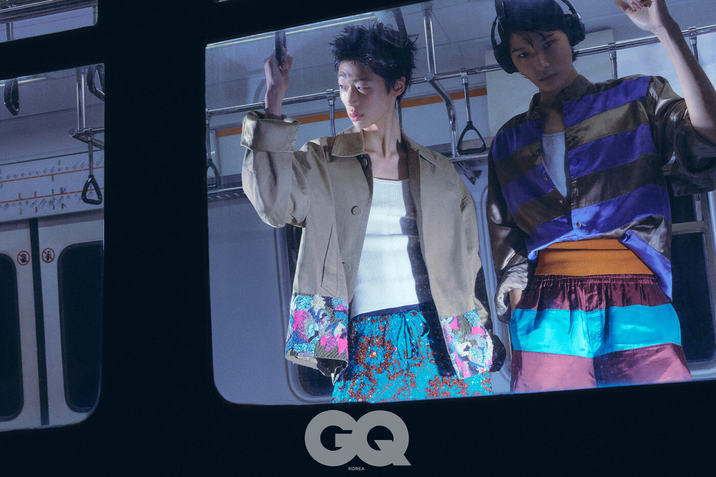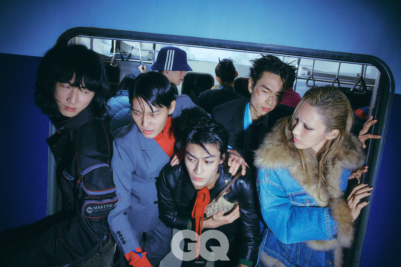 왼쪽부터 | 포켓 디테일 범백 재킷 2백7만원, 마틴 로즈 at 아데쿠베. 버킷 햇 가격 미정, 아디다스 오리지널스. 그레이 수트와 레드 트랙 재킷 가격 미정, 모두 프라다. 레더 재킷과 브라운 셔츠, 블랙 팬츠, 실크 스카프, 로고 미니 백 가격 미정, 모두 구찌. 수트 재킷과 블루 셔츠, 타이 가격 미정, 모두 구찌. 퍼 디테일 데님 재킷과 팬츠 가격 미정, 돌체앤가바나.