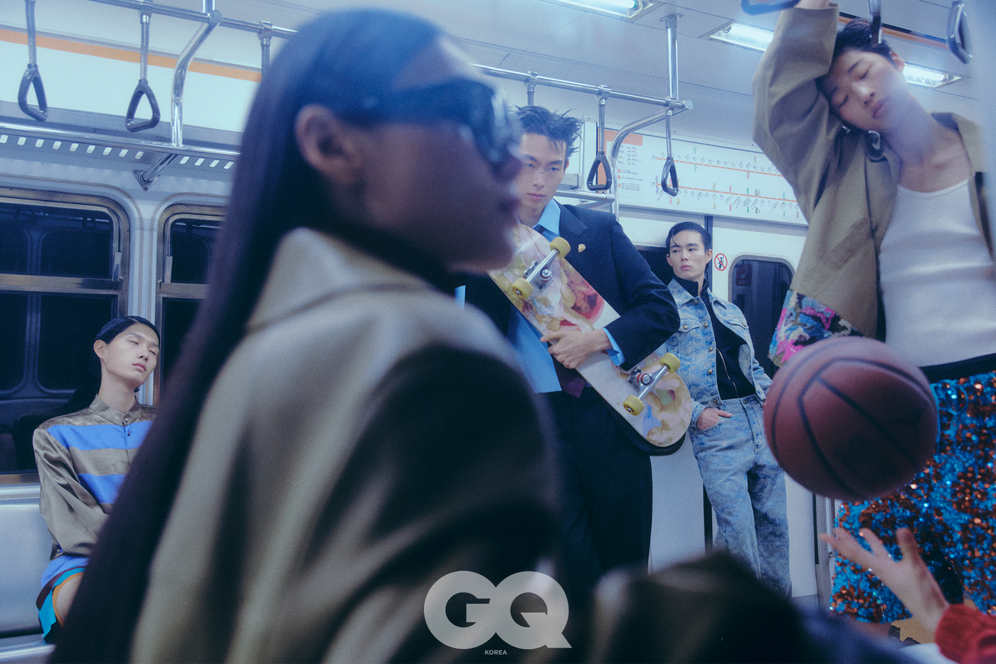 왼쪽부터 | 스트라이프 셔츠와 팬츠 가격 미정, 모두 드리스 반 노튼. 레더 코트와 터틀넥 톱 가격 미정, 생 로랑 by 안토니 바카렐로. 볼드한 선글라스 가격 미정, 톰 포드. 네이비 수트와 셔츠, 타이, 골드 브로치 가격 미정, 모두 구찌. 모노그램 패턴 데님 재킷과 팬츠, 하이넥 집업 가격 미정, 모두 루이 비통. 베이지 코튼 재킷, 화이트 톱, 스팽글 쇼츠 가격 미정, 모두 드리스 반 노튼. 나이키 조던 하이퍼 그립 볼 농구공 가격 미정, 조던.