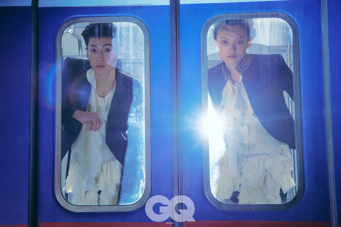 왼쪽부터 | 블랙 재킷, 오이스터 러플 톱, 팬츠 가격 미정, 모두 맥퀸. 골드워크 보더 캣어웨이 재킷, 오이스터 러플 톱, 팬츠 가격 미정, 모두 맥퀸.
