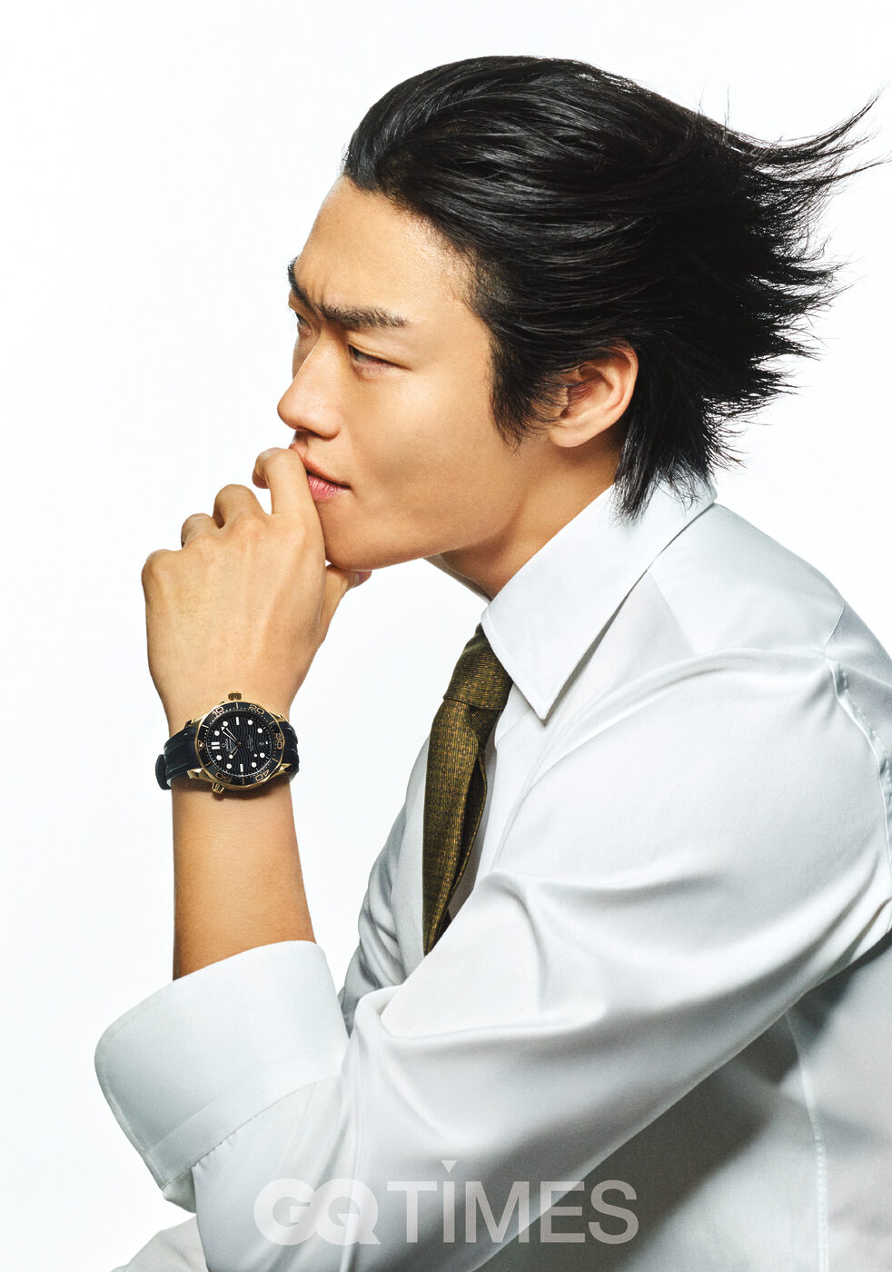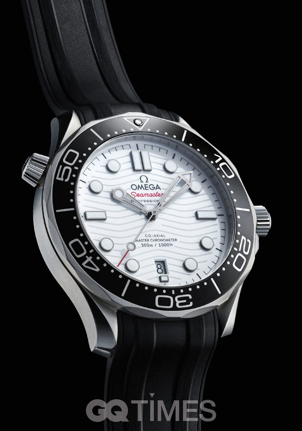 수면 위에서는 18K 세드나 골드 케이스가, 수면 아래에서는 화이트 슈퍼 루미노바를 칠한 볼록한 인덱스가 다이버의 손목을 밝힌다. 다이얼의 물결 패턴은 레이저 각인으로 정교하게 완성했다. 씨마스터 다이버 300M 42밀리미터 1천3백만원대, 오메가. 화이트 셔츠, 피나모레 1925 a t 샌프란시스코 마켓. 타이, 스틸레 라티노 a t 샌프란시스코 마켓.