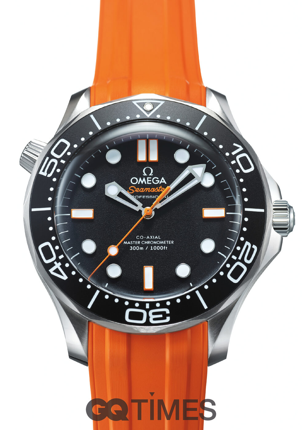 양극 산화 가공으로 내마모성과 내부식성을 갖춘 베젤이 어떤 모험도 떠날 수 있을 것만 같은 자신감을 불러일으킨다. 오렌지 컬러가 스트랩, 초침, 쿼터 인덱스 등에 적용돼 경쾌함을 더한다. 씨마스터 다이버 300M 42밀리미터 9백만원대, 오메가.